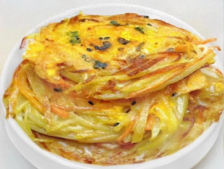 土豆搭配胡蘿蔔與雞蛋,膳食纖維、維生素、優質蛋白一應俱全。金黃酥脆的口感,一口咬下去超滿足,簡直是早餐的絕佳選擇。