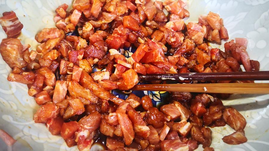 2、準備餡料:準備一些豬肉丁,加入適量的鹽、生抽、料酒、胡椒粉等調料攪拌均勻,醃製一會兒。再切點蔥花、薑末放入肉餡中,增加香味。然後把切碎的車前草和醃製好的肉餡混合在一起,加入適量的香油、雞精等調味,順着一個方向攪拌,讓餡料充分融合。