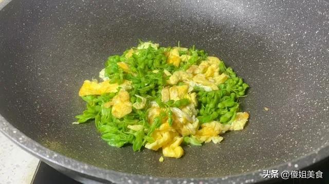 - 觀察蛋液基本凝固(大約80%變成固體),夜香花也變得翠綠油亮時,快速掂幾下鍋(或用鍋鏟輔助翻動),確保受熱均勻。