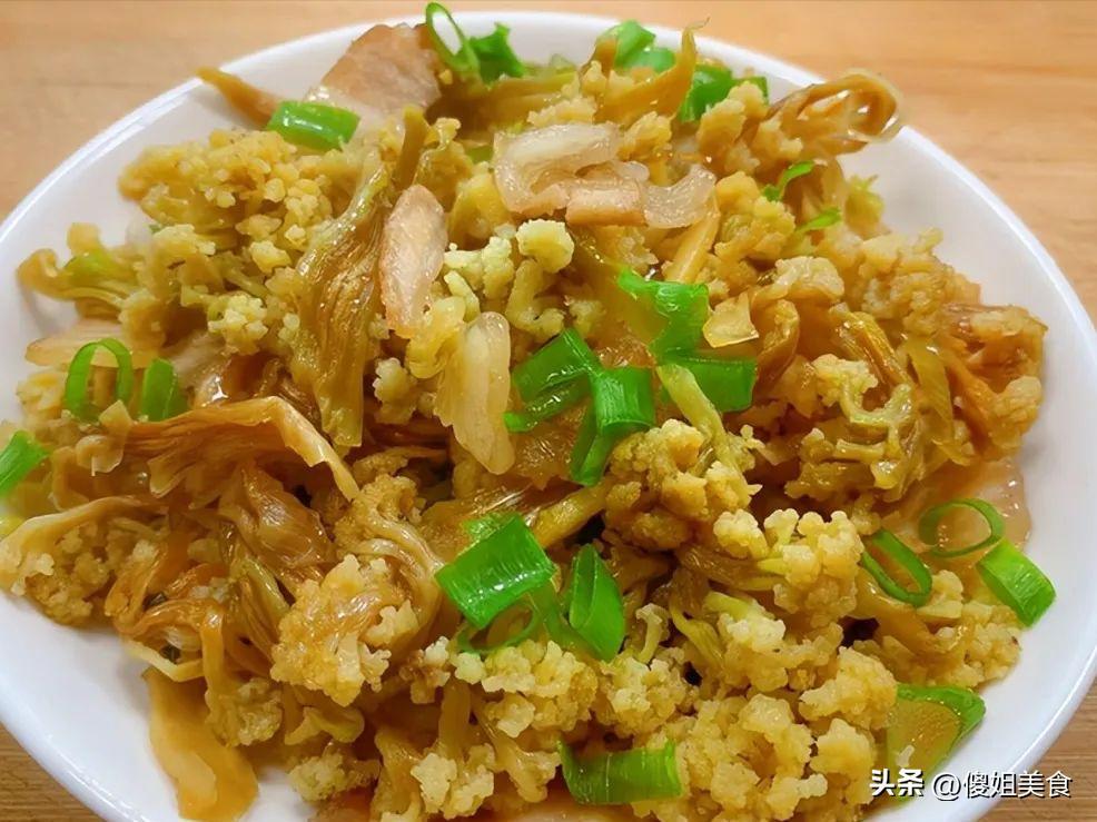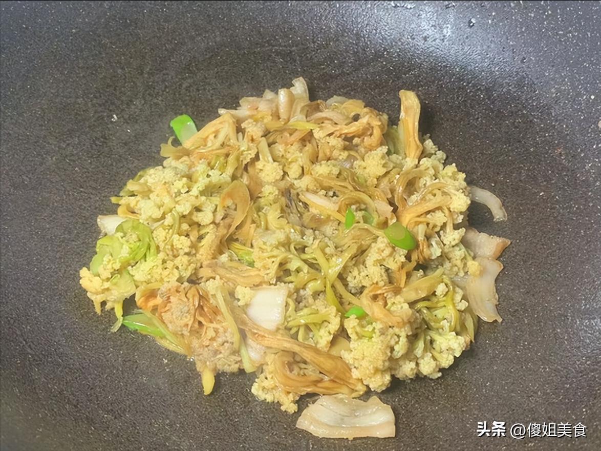 泡發好的花菜乾瀝乾水,倒入鍋中,中大火,痛快翻炒!鍋鏟與鐵鍋碰撞出鏗鏘的節奏,花菜乾特有的、經陽光淬鍊過的濃郁香氣被徹底激發出來。接着把炒好的肉片回鍋,淋入一圈醬油,一小勺白糖提鮮,撒上切好的青蒜苗段,再奮力翻炒幾下,讓所有味道在熱力中擁抱融合。