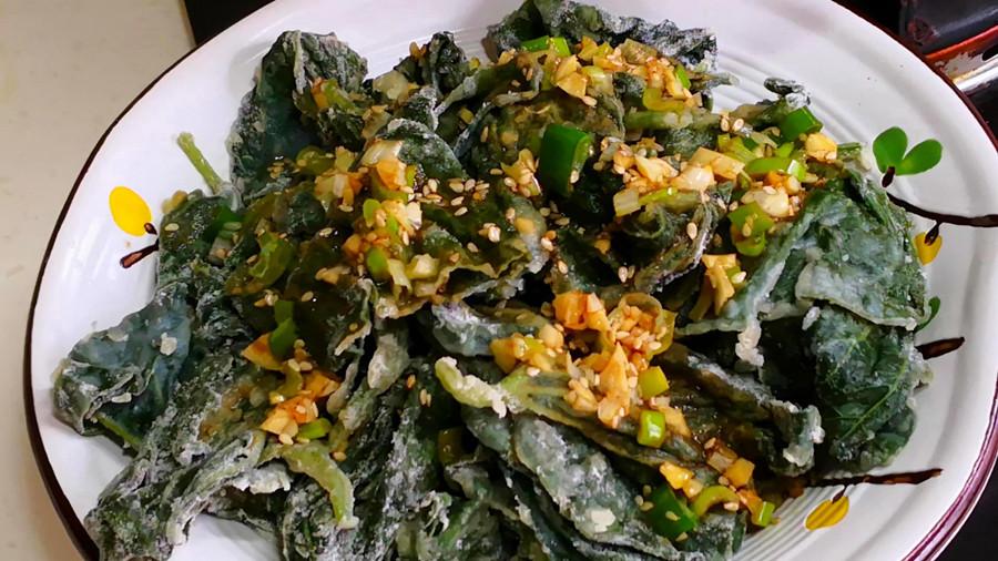 下手輕輕抓拌均勻,讓每片葉子都均勻地裹上一層薄薄的麪粉,多餘的麪粉抖掉。