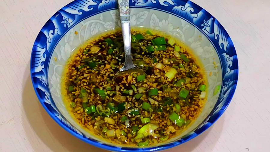 3.調個涼拌汁:碗中放入切碎剁細的蒜末,再淋入一勺熱油激發出香味,然後加入1勺香醋、2勺生抽,一點鹽和適量白糖、香油,攪拌均勻後備用。