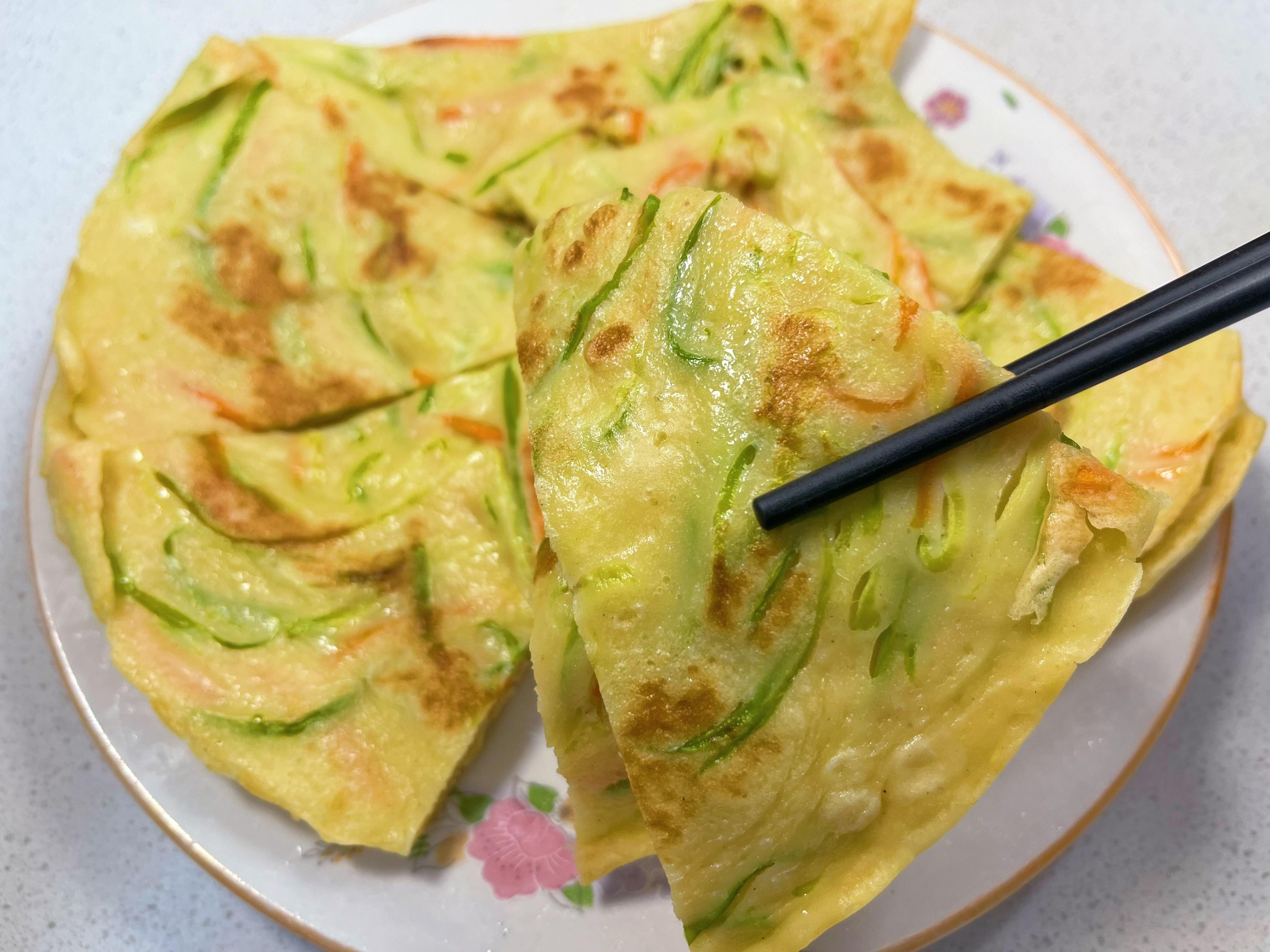 剛出鍋的蛋餅,熱氣騰騰,香氣直往鼻子裏鑽。那金黃中點綴着翠綠與橙紅的色彩,光看着就讓人心生歡喜。忍不住先嚐一小口:外層因煎烙帶點微微的焦脆感,內裏卻無比軟嫩,鹹淡適宜,口感豐富又和諧。