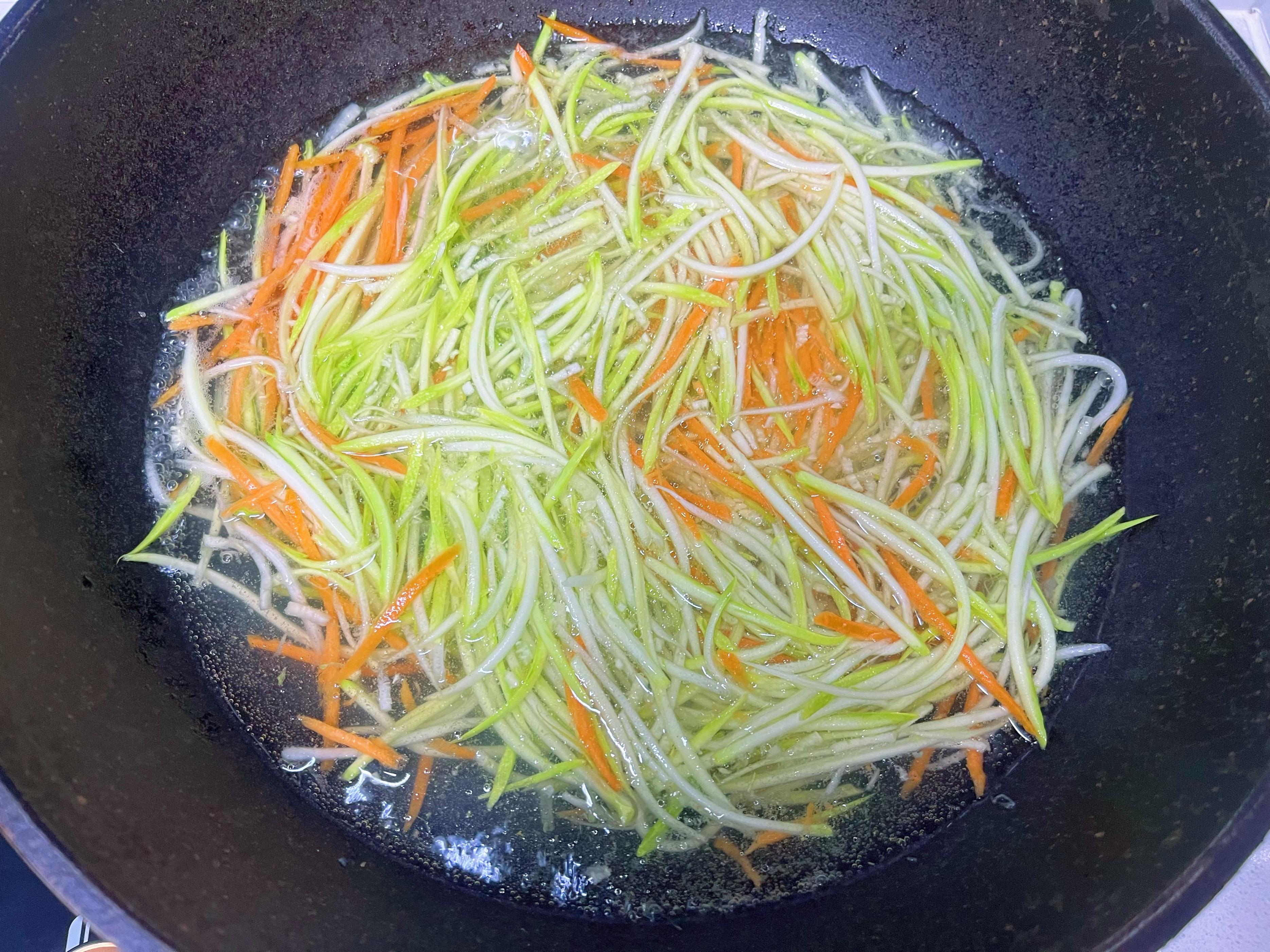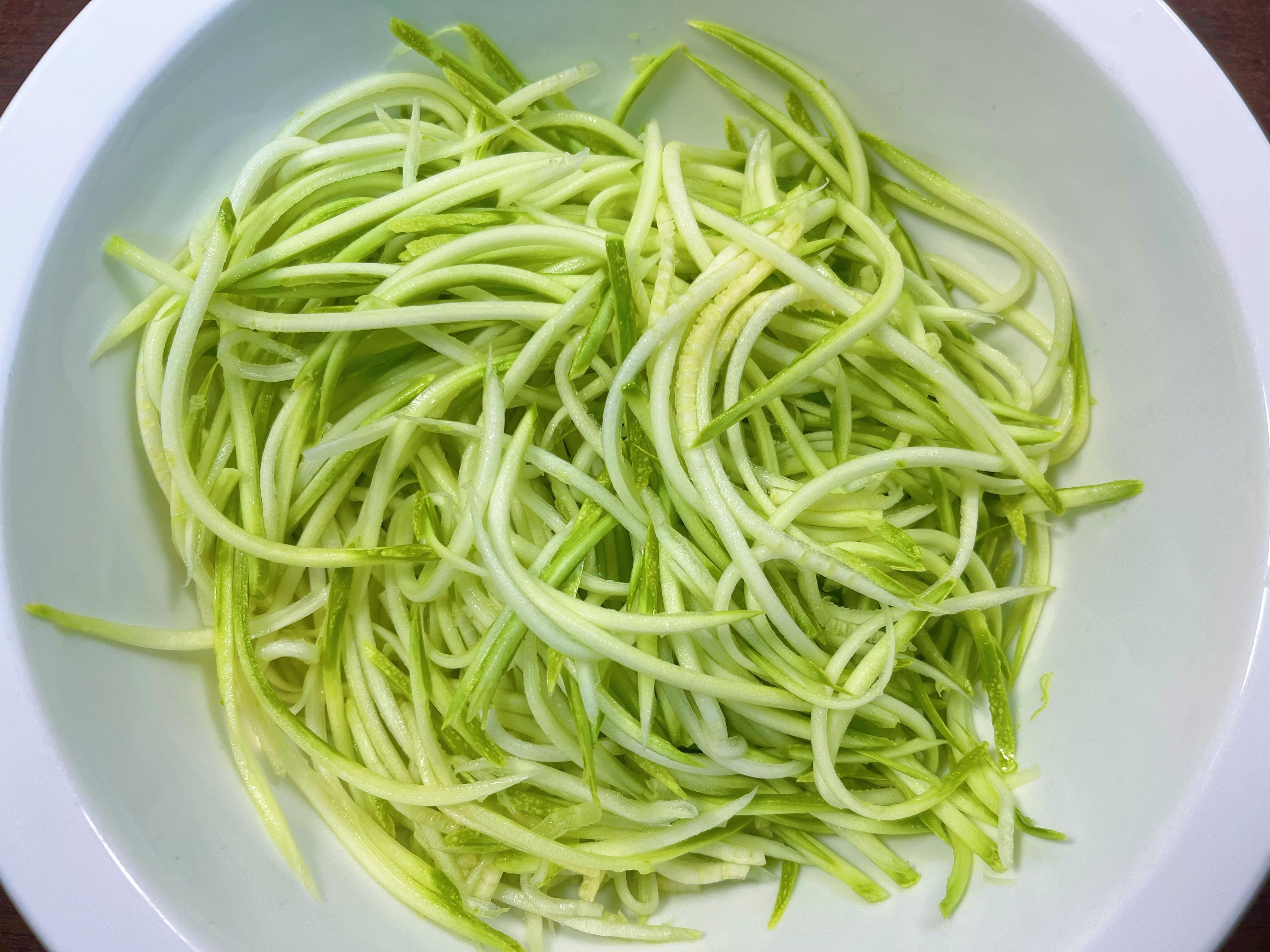 1、西葫蘆和胡蘿蔔都擦成細絲。然後將西葫蘆絲和胡蘿蔔絲放入煮鍋焯水,過涼後攥幹水分。