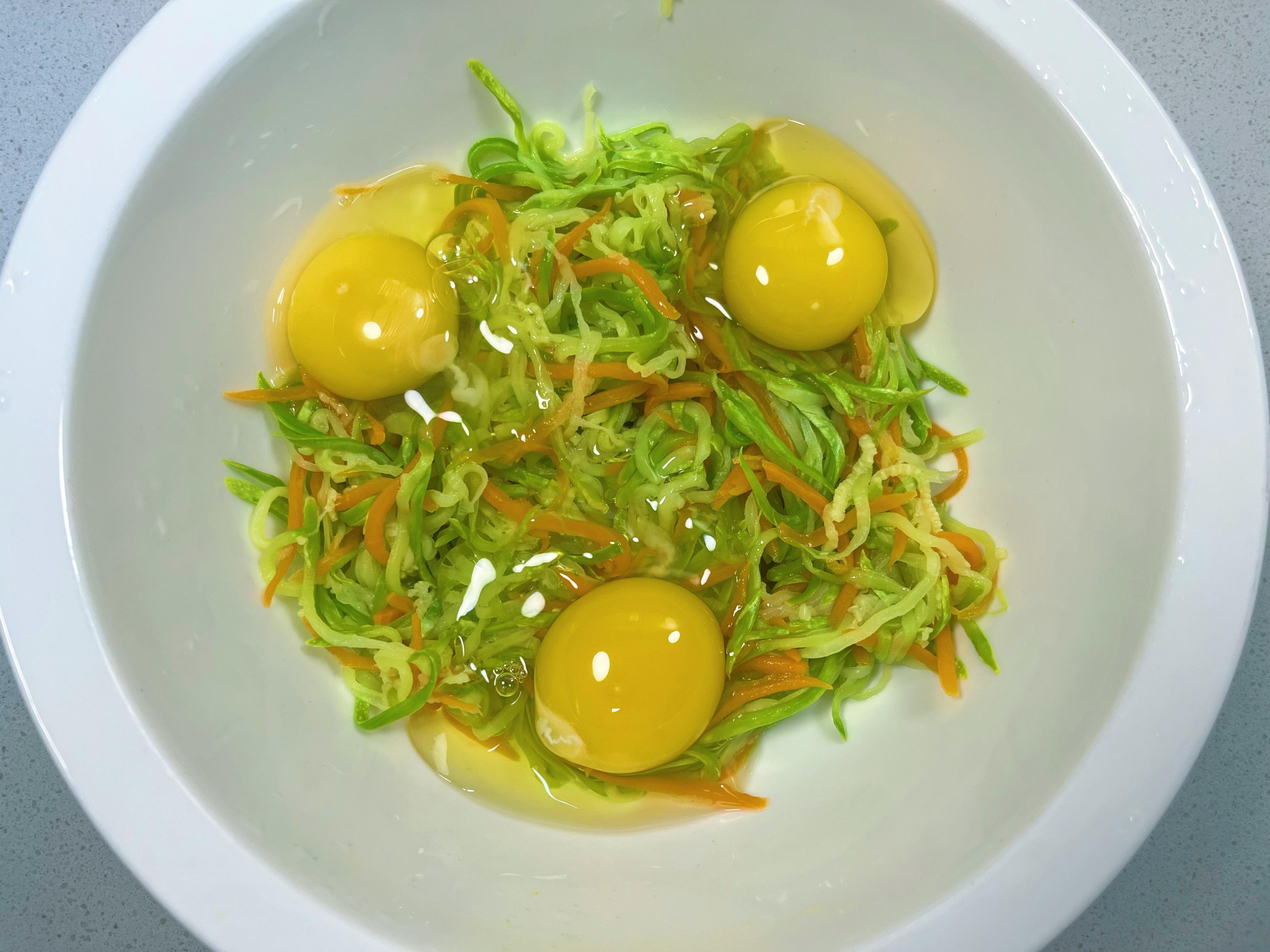 2、大碗裏打入雞蛋,加鹽、胡椒粉、香油,攪打均勻成蛋液。接着把擠乾的西葫蘆絲和胡蘿蔔絲都放進去,用筷子輕輕拌勻,讓每一根蔬菜絲都裹上金黃的蛋液。最後,把麪粉均勻地篩入或撒入碗中,再次耐心攪拌。麪粉別一次全倒進去,邊倒邊攪,直到麪糊稠度合適——筷子提起來時,麪糊能緩緩流下,不斷線,但也不至於稀得如水一般。