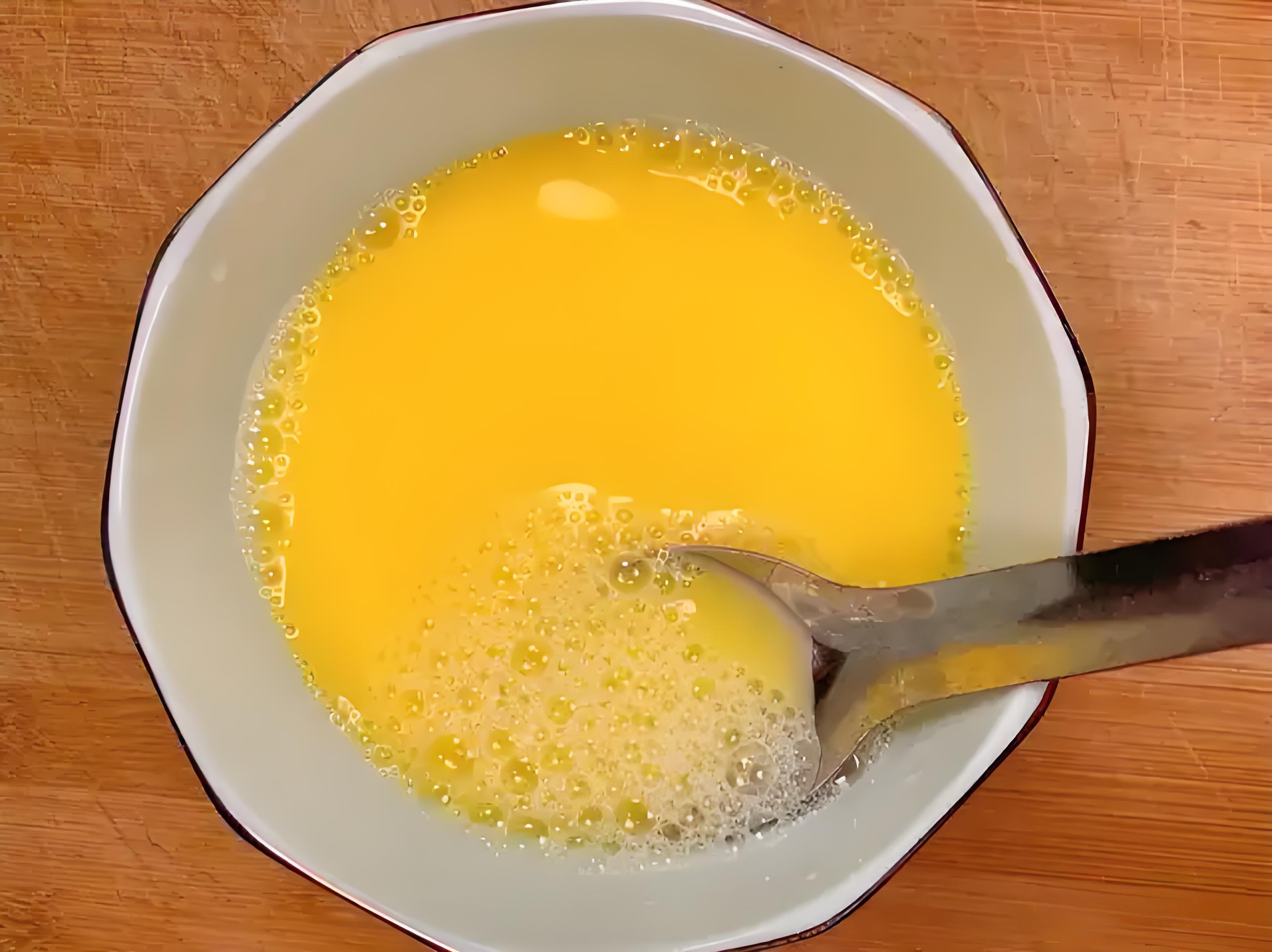 1、調蛋漿:雞蛋+鹽打勻,兌1.5倍溫水攪打融合