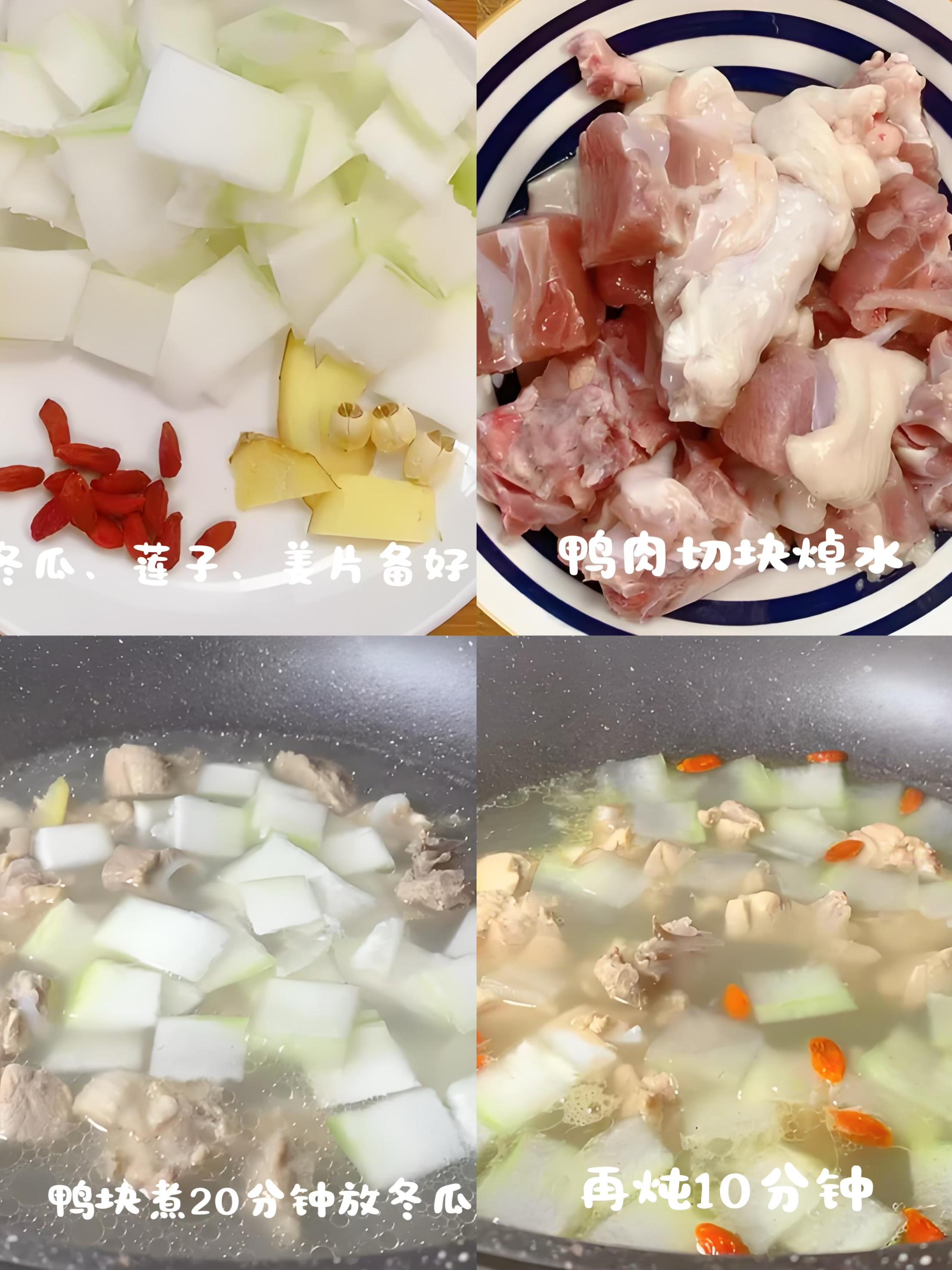 3、處理好的鴨塊、薏米(如果用)、幾片姜放入湯鍋,加足量清水。大火燒開撇淨浮沫,轉小火,蓋上蓋子,耐心慢燉1小時左右,鴨肉燉到軟爛脫骨。
