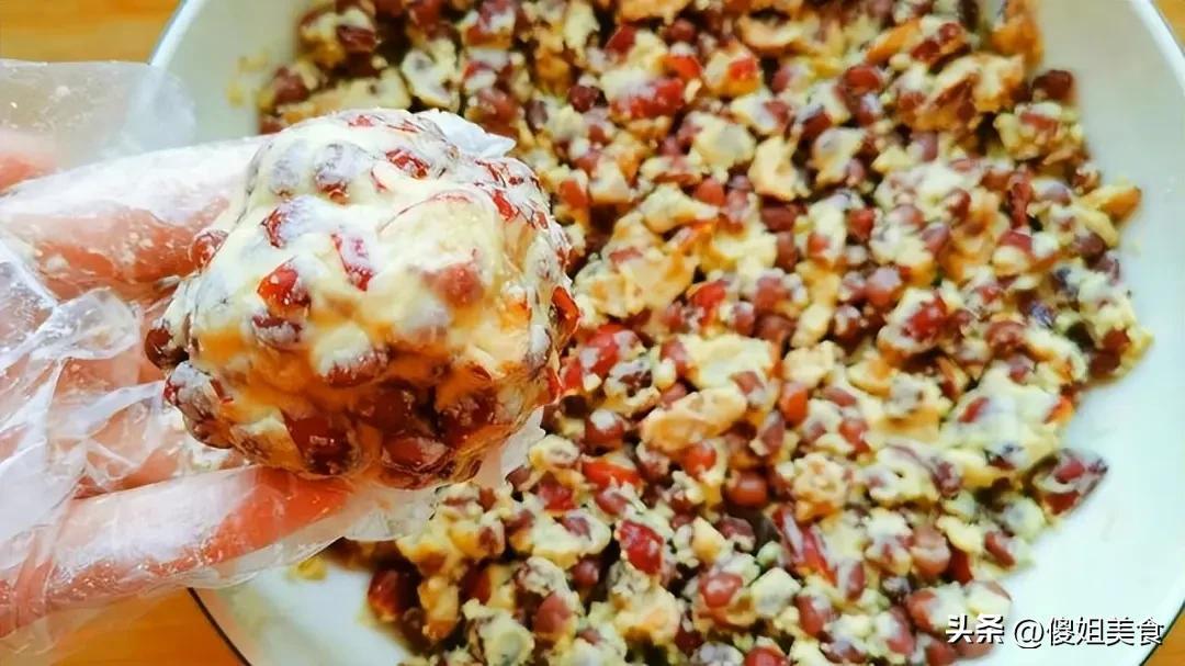 - 麪粉塑形: 少量多次地加入麪粉。一邊加一邊攪拌,讓麪粉均勻地裹上每一粒紅豆和紅棗。麪粉別貪多,加多了口感會發硬。祕訣就是:加到紅豆紅棗混合物能勉強捏成團,不會散開,但手感依然溼潤軟糯的狀態就剛剛好! 這一步真的不需要太多面粉,它只是默默起到黏合的作用。