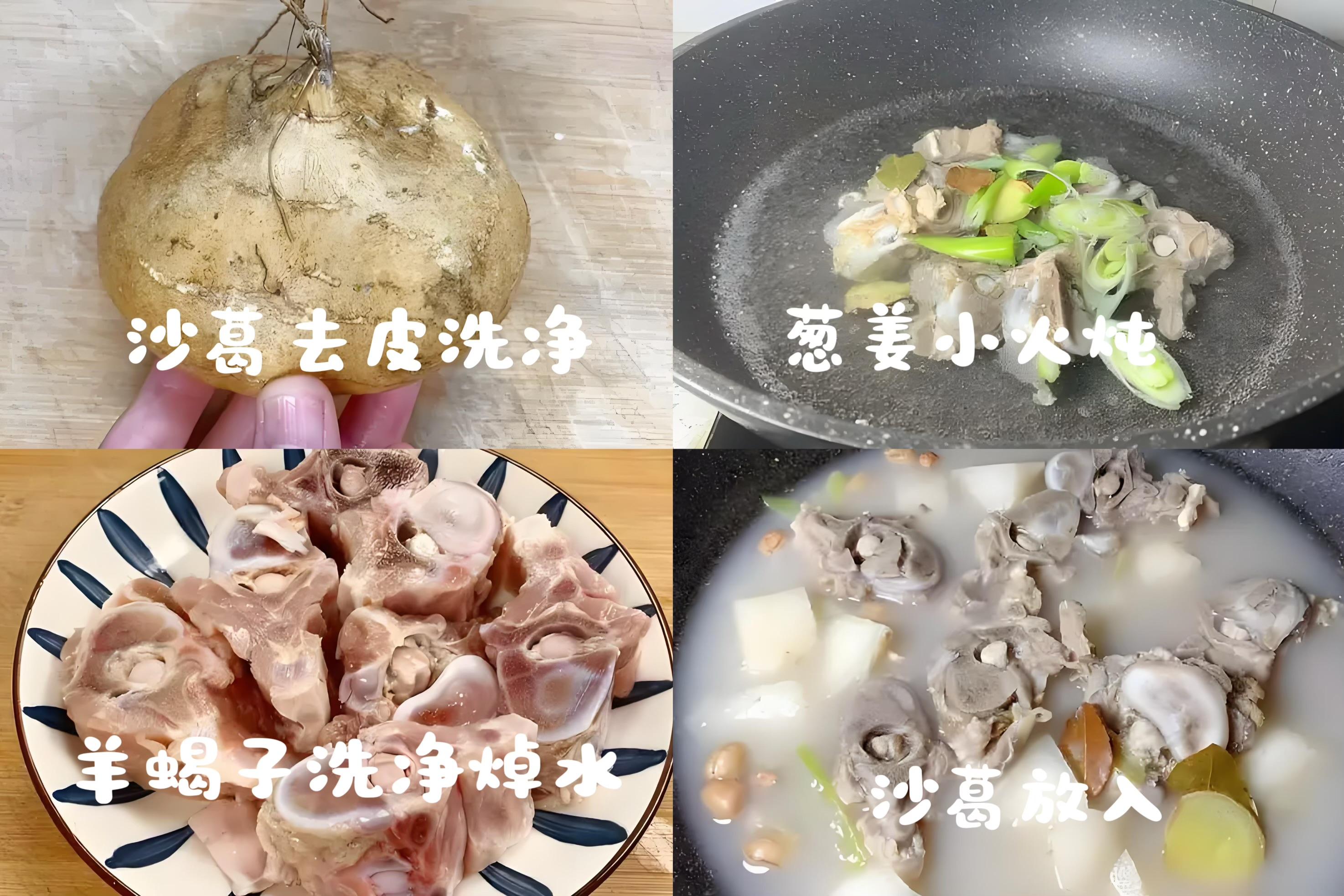 備料: 羊蠍子500克、沙葛(涼薯)1大個(約400克,去皮切滾刀塊)、生薑一大塊(拍松)、蜜棗2顆、清水足量。