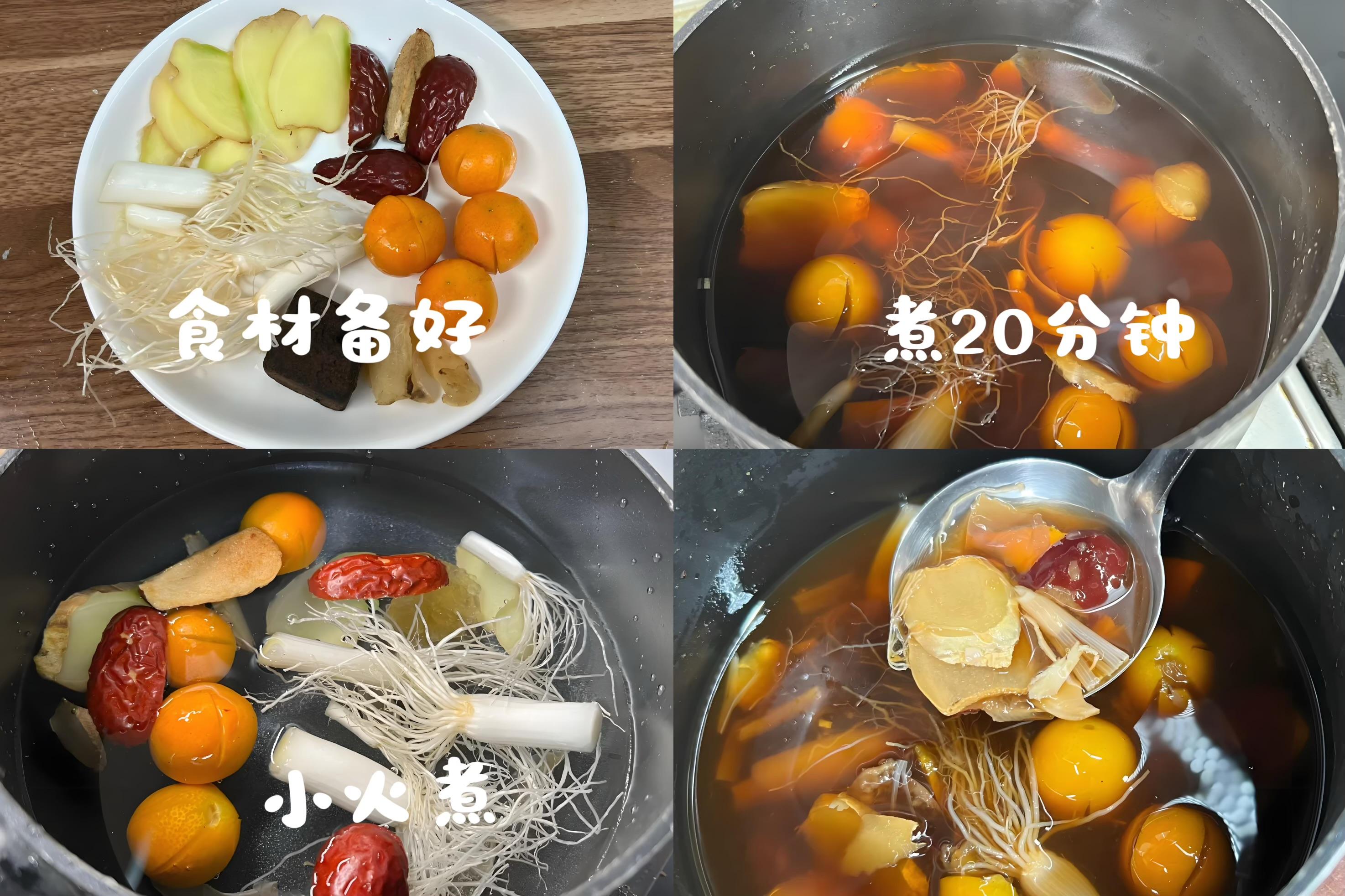 2、大火燒開後轉小火,慢悠悠煮上20分鐘,讓陳皮的香、姜的辛都熬出來。