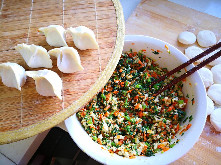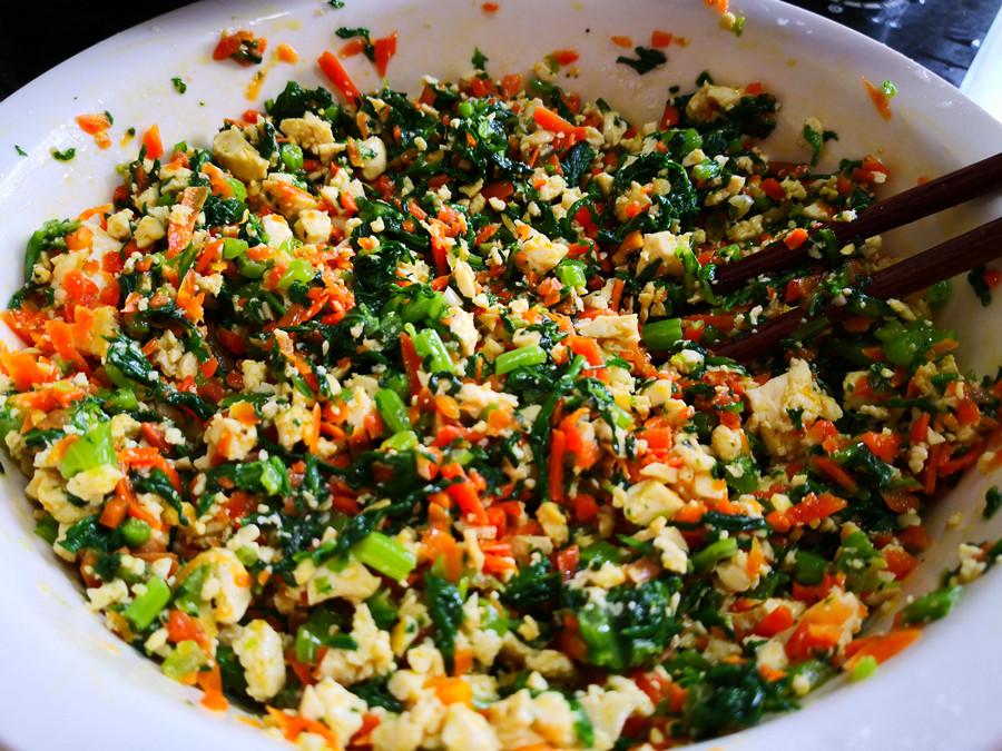 1.茼蒿洗淨,下鍋焯水30~50秒,然後撈出過涼,瀝乾水分後切碎剁細備用。