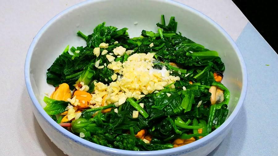 1.木耳菜洗淨後下鍋焯燙30秒,焯水時少加一點鹽和食用油,可使它的顏色保持翠綠,撈出後過涼,抽控幹水分後切成小段備用。
