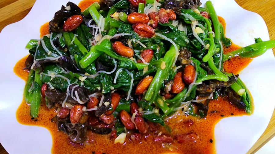 6.粉絲泡軟後切成長段,放入木耳菜中,晾涼的花生米也倒入,接着倒入涼拌料汁的芝麻醬,用筷子充分攪勻即可。