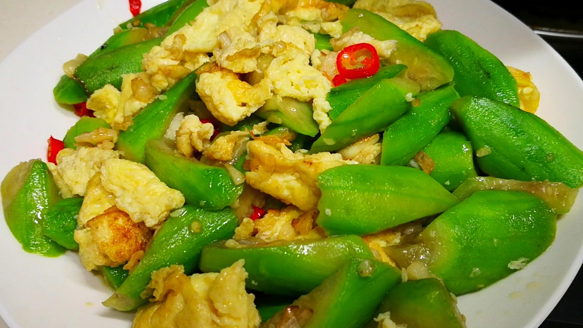 3.起鍋加入適量的油,油熱後下入蒜片炒香,接着撈出絲瓜塊瀝乾水分放入鍋中,大火炒至絲瓜變軟,微微出水時,下入之前炒好的雞蛋,接着加入適量的食鹽,快速翻炒均勻後,即可出鍋。
