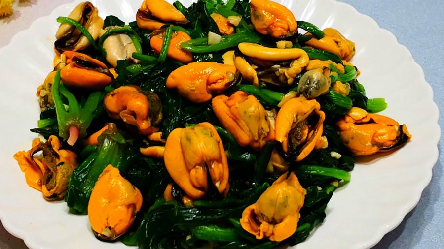 1.海虹適量清洗乾淨外殼後放入鍋中,煮至海虹開口後關火,取出海虹肉備用。