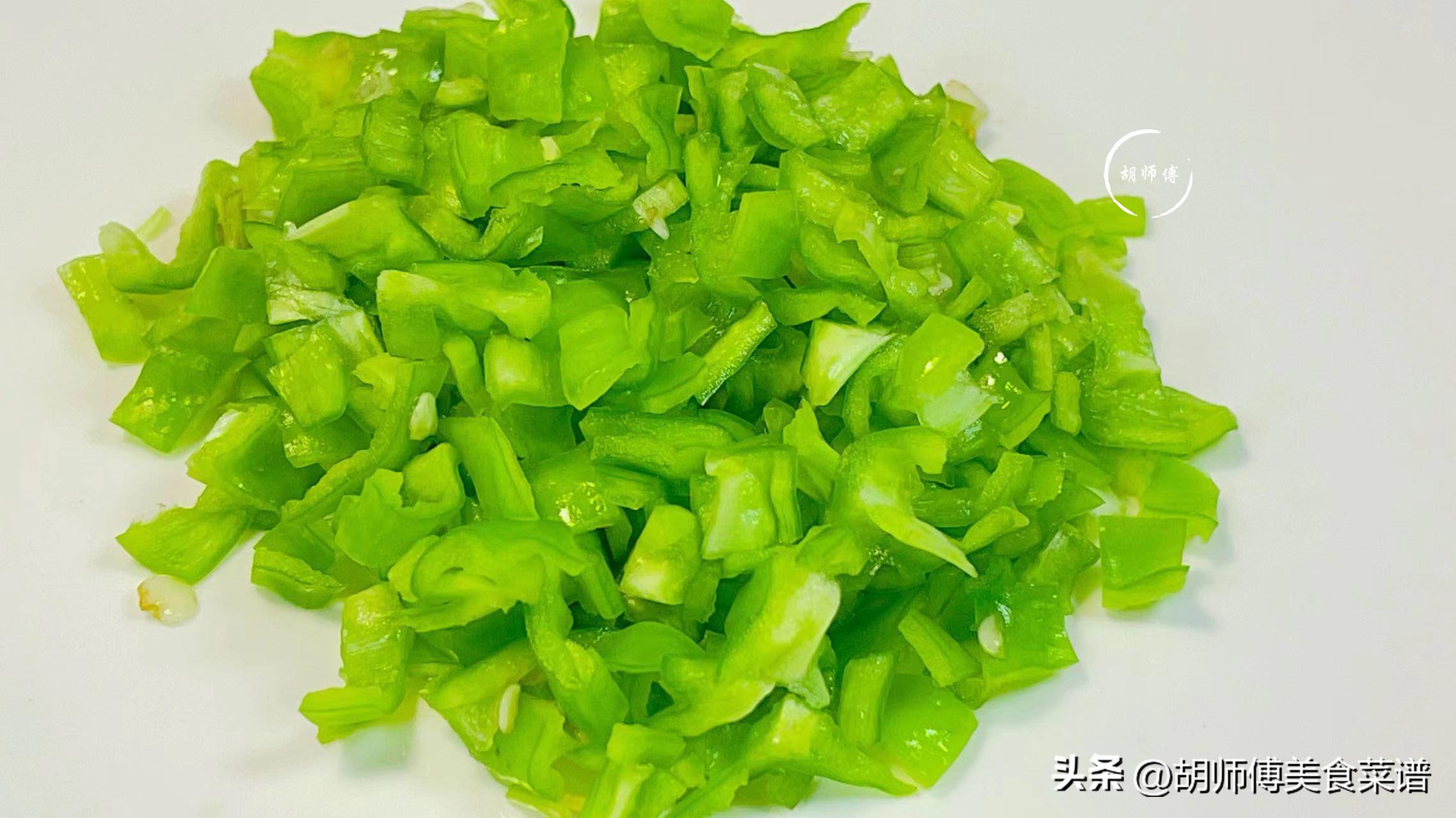 第二步:將青椒沖洗乾淨後切成小碎末備用,喜歡喫辣的,可以用杭椒代替青椒。