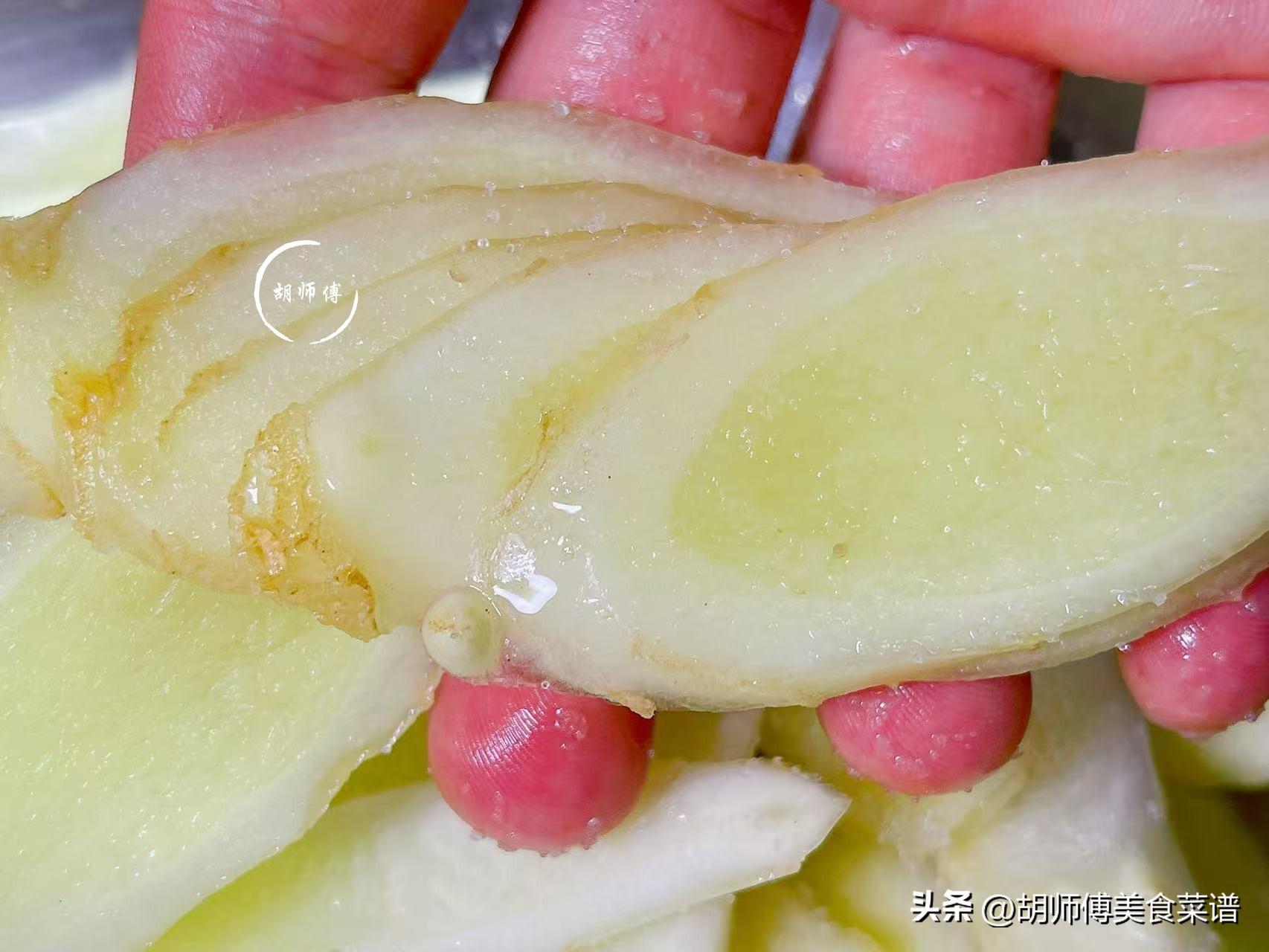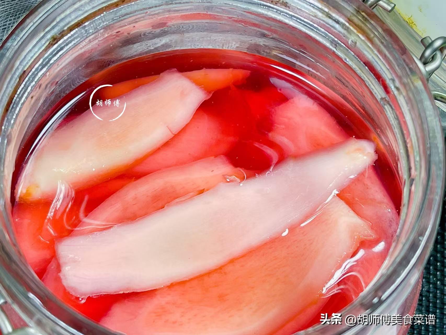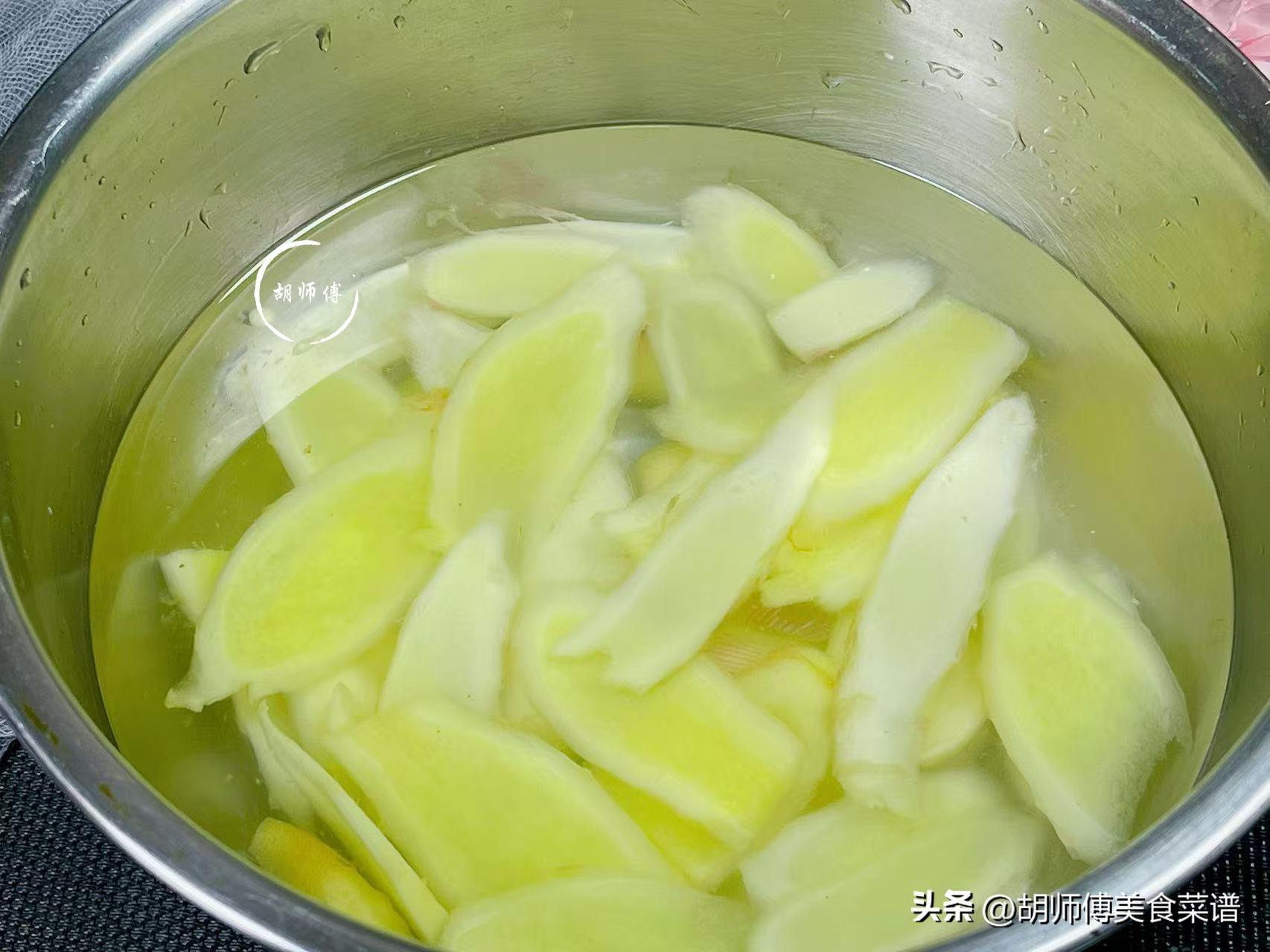 第一步:首先將仔姜沖洗乾淨,然後把仔姜切成0.3釐米厚的薄片,接着將仔姜和食鹽放入盆中,將仔姜醃1小時後,將仔姜醃出來的水全部倒掉。