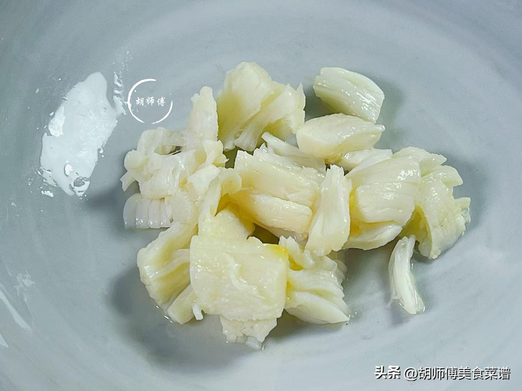 第一步:將乾貝放入熱水中浸泡1小時左右,直到將乾貝完全泡脹後撈出洗淨,然後再用刀將乾貝按壓成絲狀備用。