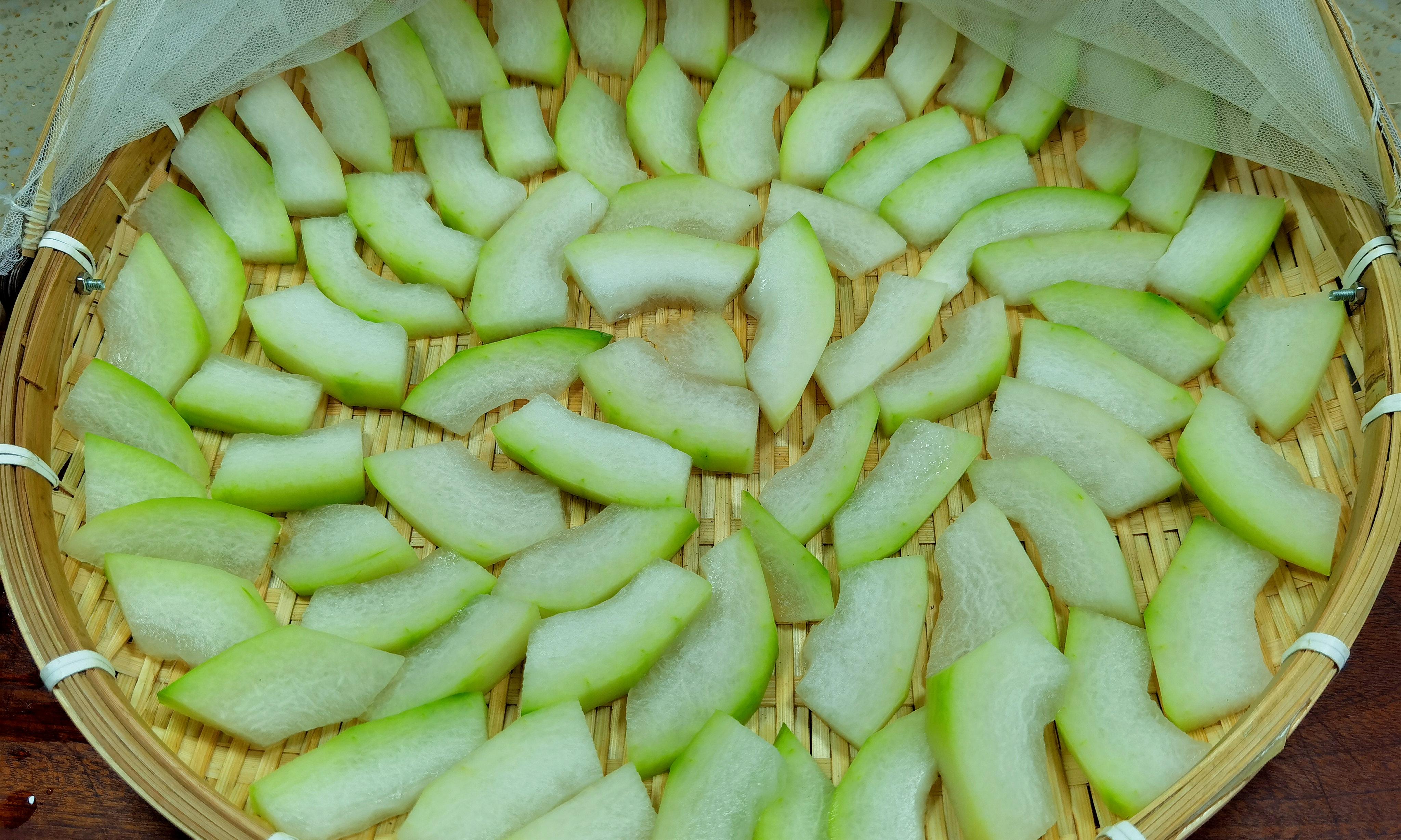 大冬瓜水分豐沛,曬乾後卻凝練出清透的質地與含蓄的甜。去皮去瓤,切成厚片(半釐米左右爲佳),直接攤曬。在烈日下,厚實的瓜片會漸漸變得薄而透明,邊緣微微卷曲。這冬瓜幹煮湯或燜肉時,能迅速吸收湯汁精華,口感變得軟糯卻不失形,入口帶着一股清潤的甘甜,爲油膩的葷食巧妙解膩,添上一份清朗。