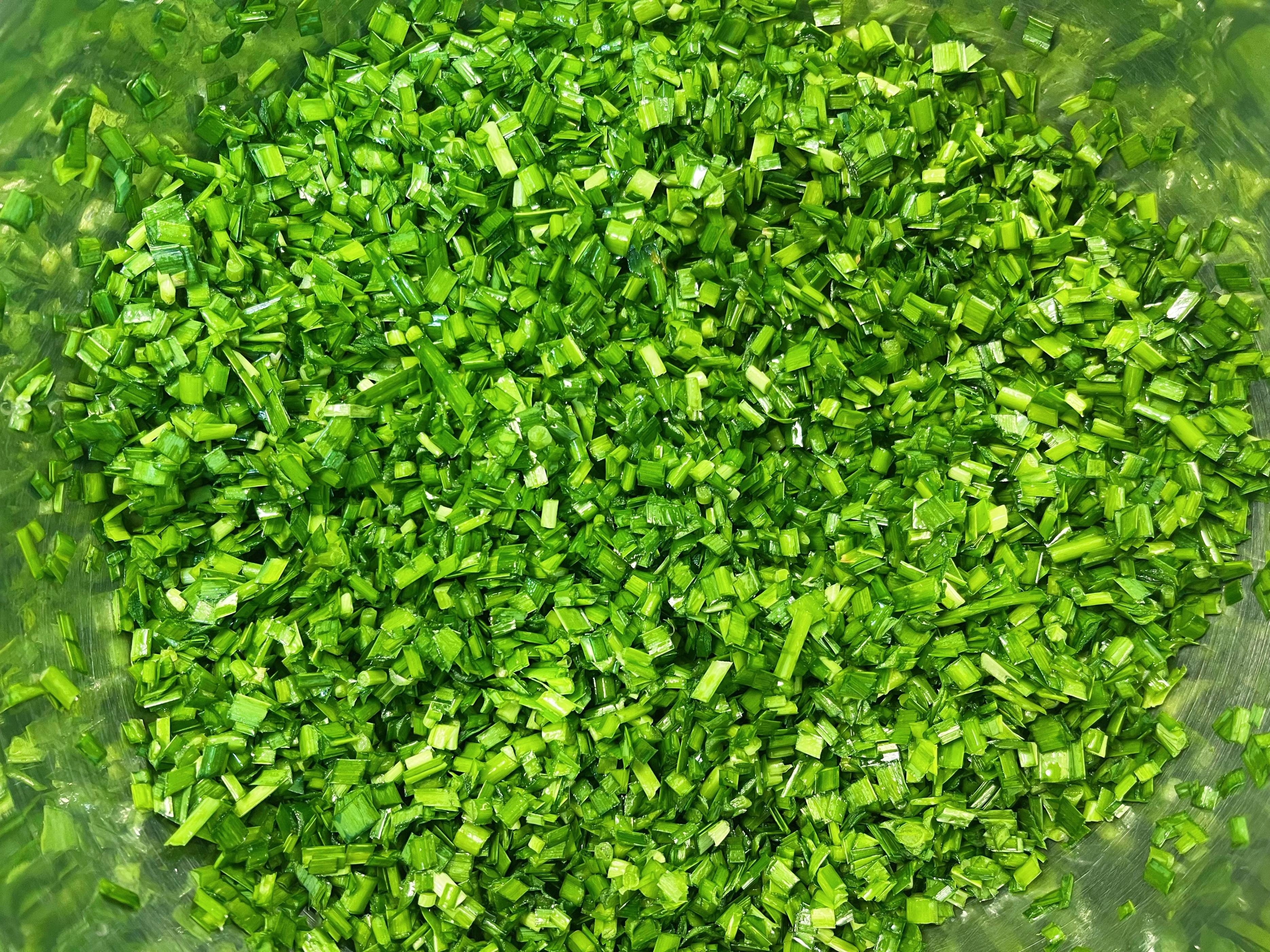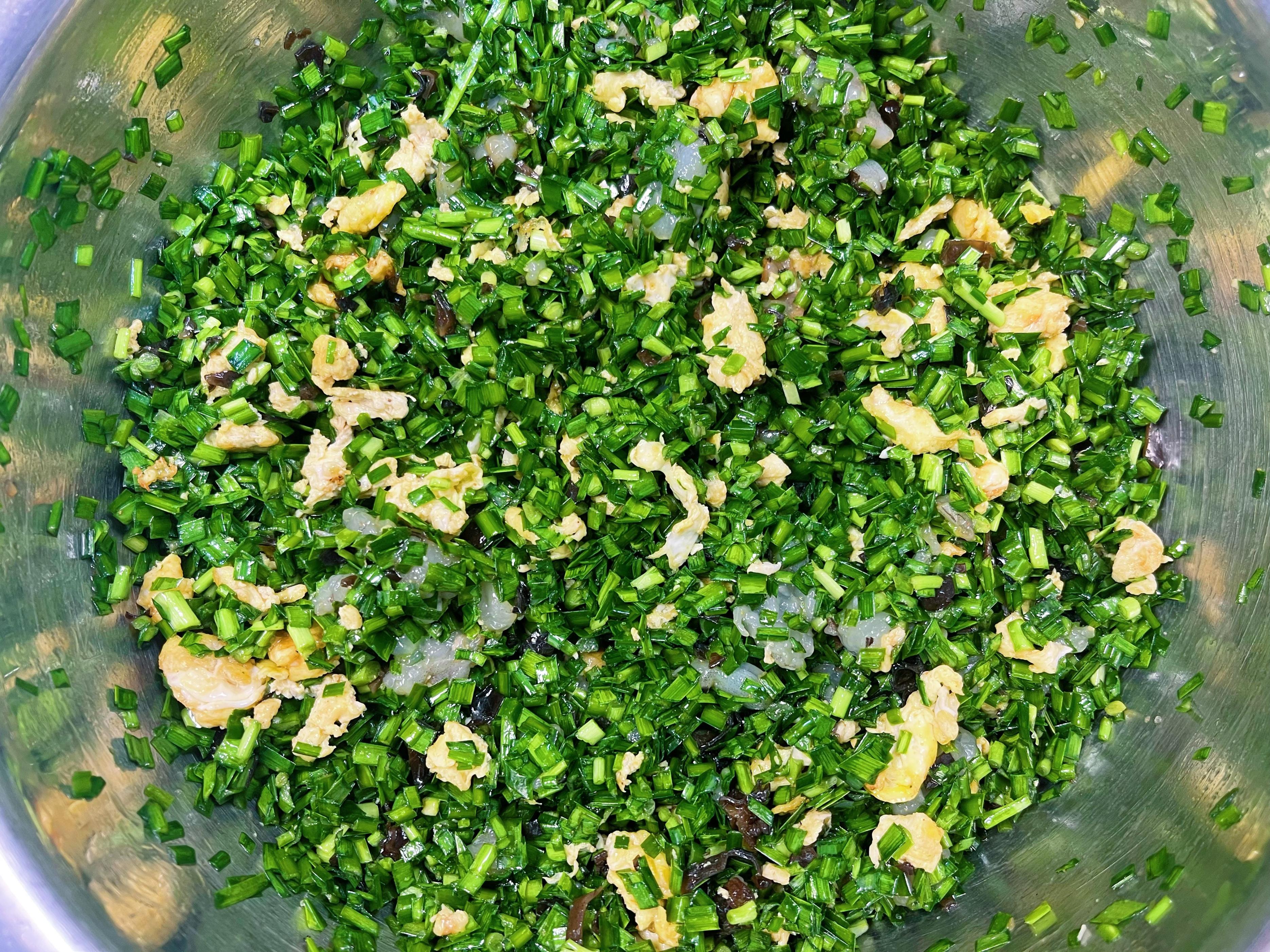 3、麪糰鬆弛的時間,正好準備靈魂餡料。 韭菜洗淨,一定一定要徹底晾乾表面水分!切成細末放入大碗。第一步不是加鹽! 而是先倒入足量的香油或熟油(約2湯匙),用筷子快速拌勻,讓每一粒韭菜末都被油膜包裹住,鎖住韭菜水分。