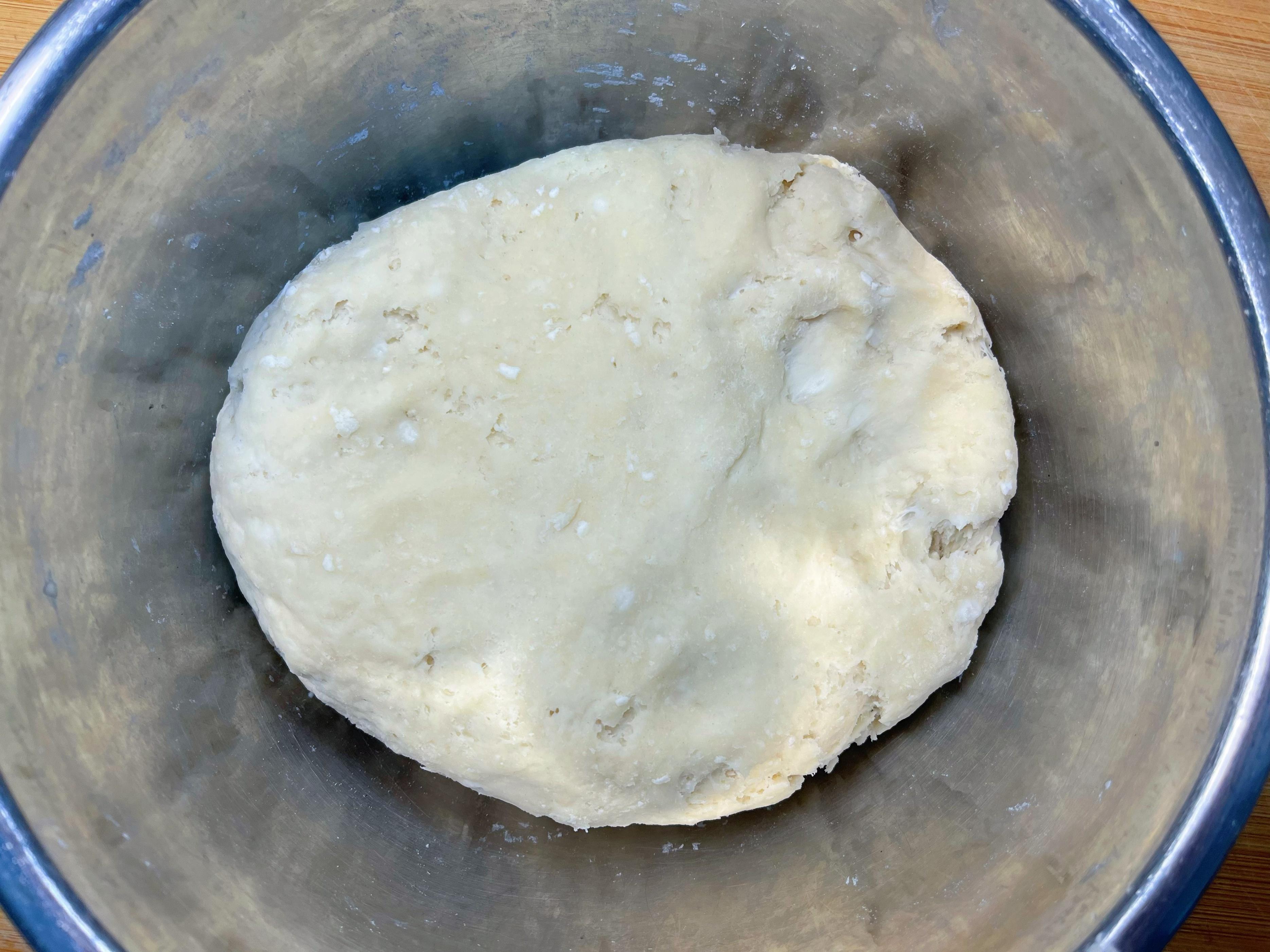 邊倒鹽水邊用筷子快速攪拌麪粉,攪成大片均勻的雪花絮狀。這時盆底應該沒什麼乾粉了,下手把它攏成團。蓋上溼布或保鮮膜,讓它“醒”個15分鐘。