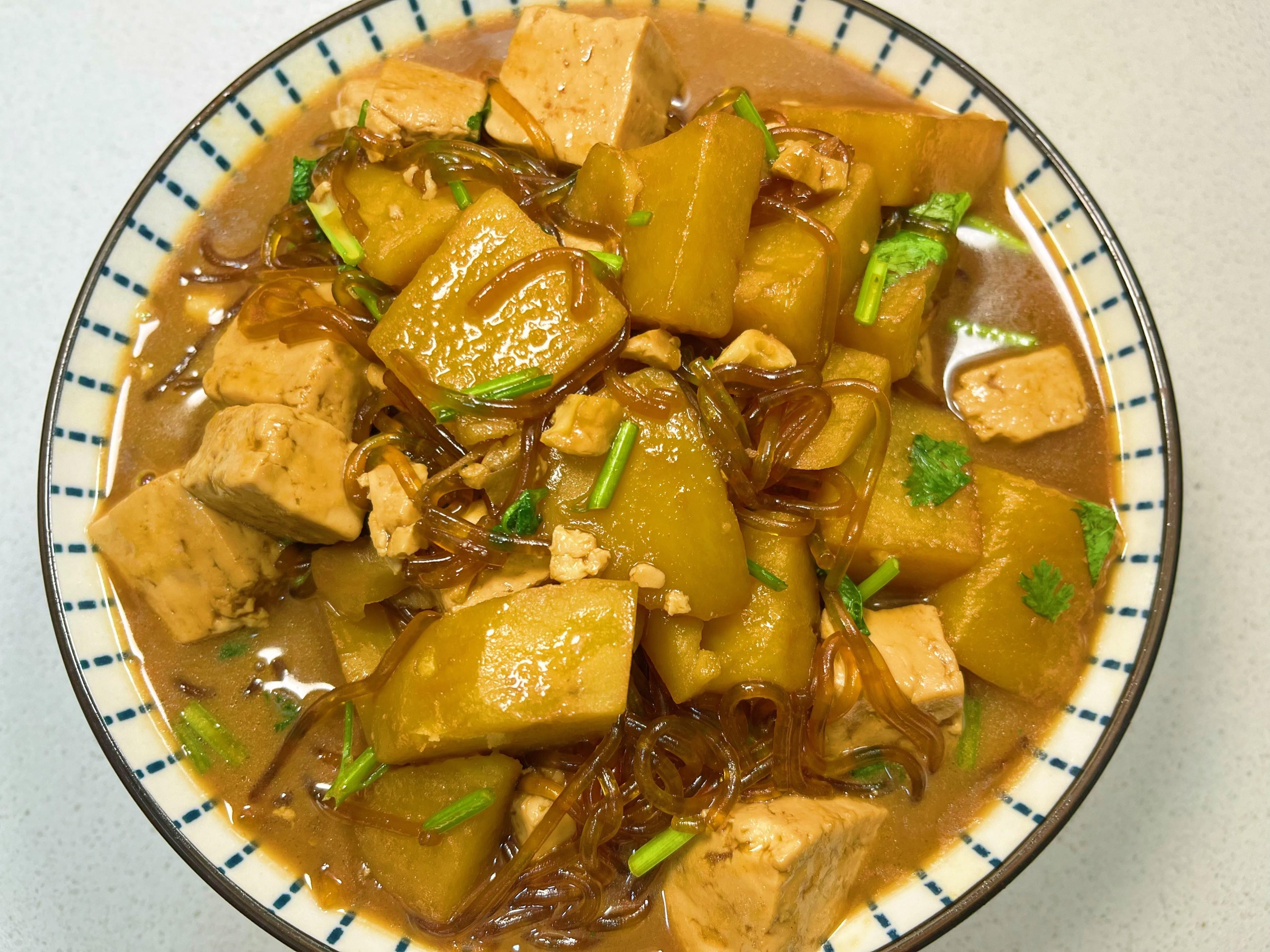 4、把切好的豆腐塊輕輕滑入鍋中。再把泡軟的粉條瀝乾水分,也放入鍋中。