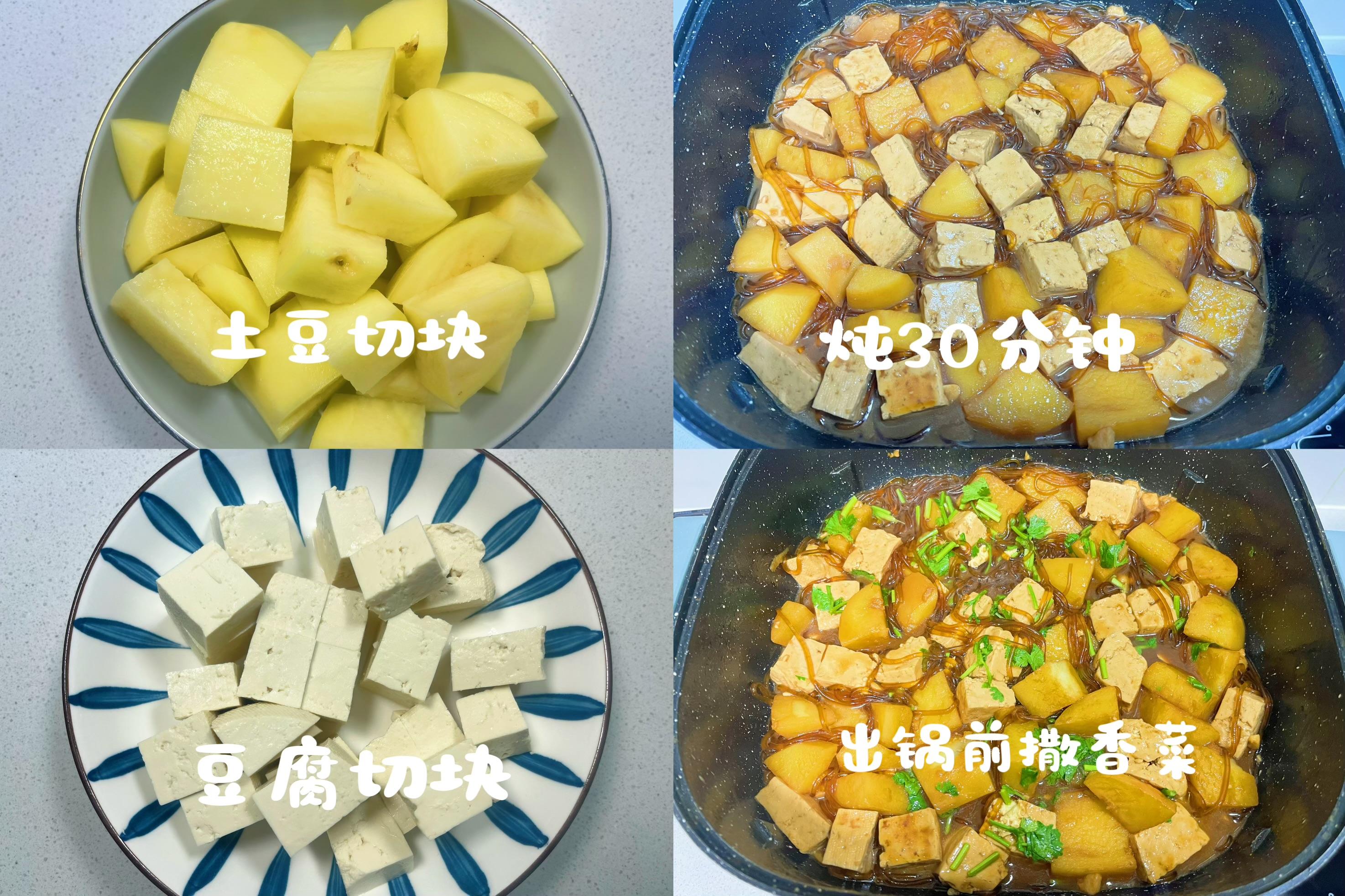 1、土豆洗淨削皮,切成塊。豆腐切成稍厚一點的方塊或三角塊。紅薯粉條用溫水泡軟(大約15-20分鐘,摸起來軟了就行)。香菜洗淨切小段。薑切片。