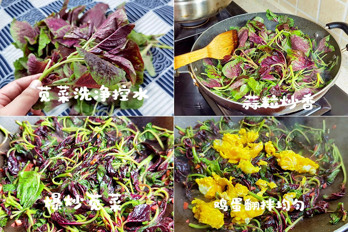 1、摘去莧菜的老根和比較老的莖,只留嫩莖葉。用清水多衝洗幾遍,瀝乾水分,不用切太碎,稍微掐成段就行。大蒜拍扁切末。雞蛋打入碗中,加少許鹽,攪打均勻。