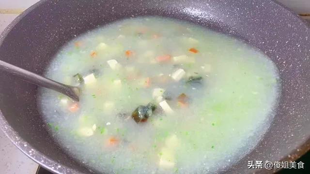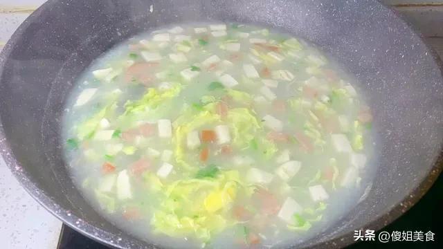 4、立刻!馬上!加入足量的清水(喝多少湯加多少水)。緊接着,主角冬瓜片“撲通撲通”跳下水!開大火,燒它個咕嚕咕嚕冒大泡!水開後,保持中火,讓冬瓜片盡情“泡澡”。煮個幾分鐘,看到冬瓜片變得透明,用勺子一碰就軟綿綿的,說明它熟了。這時候,主角二號——嫩豆腐塊,可以溫柔地滑入湯中了!輕輕推散開。