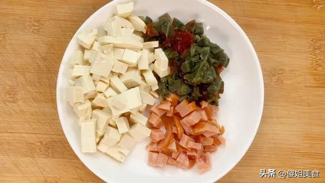 2、嫩豆腐放在案板上,切成大小適中的塊兒。松花蛋剝殼,用細線勒或者刀沾水切,切成小丁。看那溏心流淌的蛋黃,鮮味的祕密就在這兒了!火腿或切小丁。