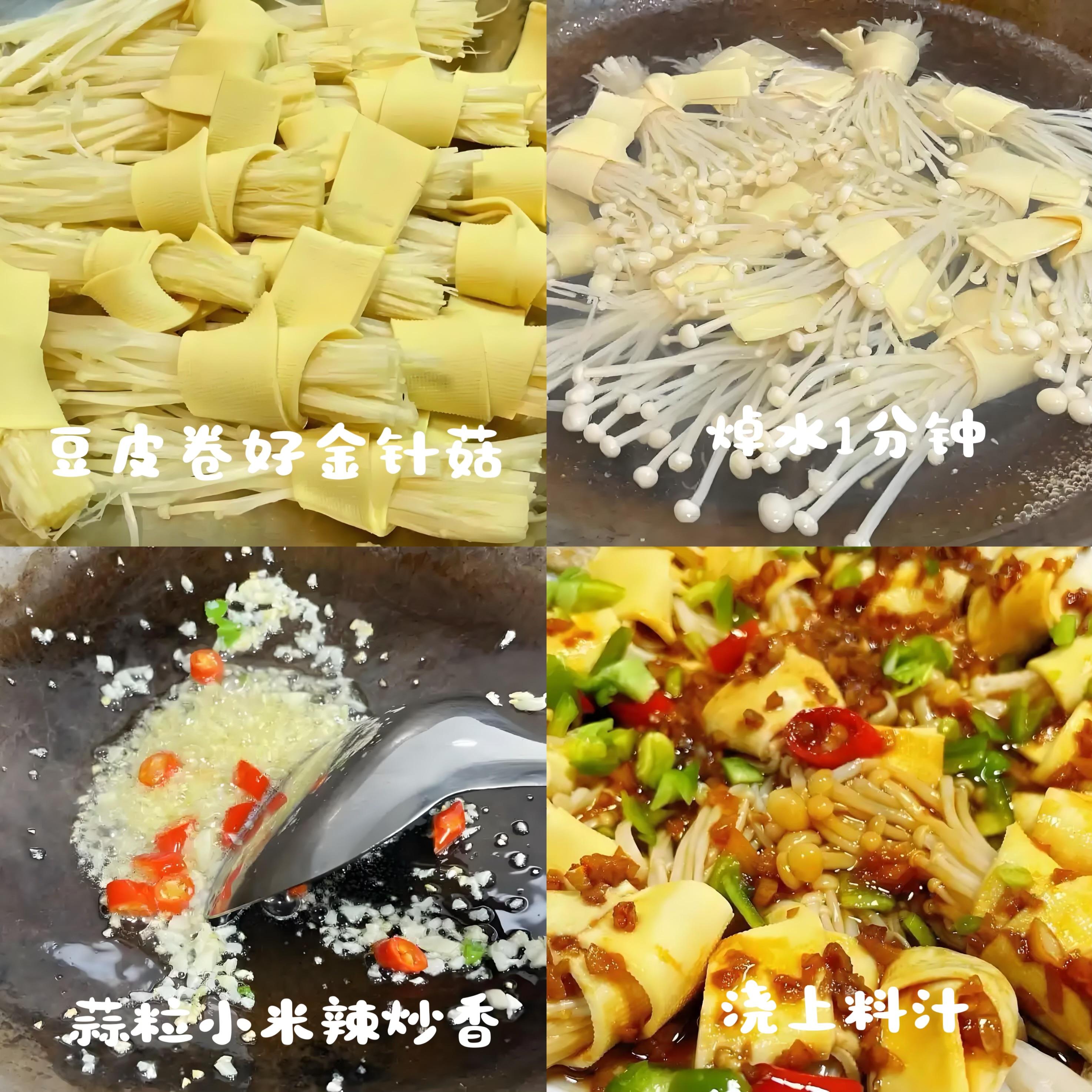1、金針菇切去根部,洗淨撕開。豆皮用開水燙一下消毒變軟,切成合適寬度(約5-6釐米寬)的長條。