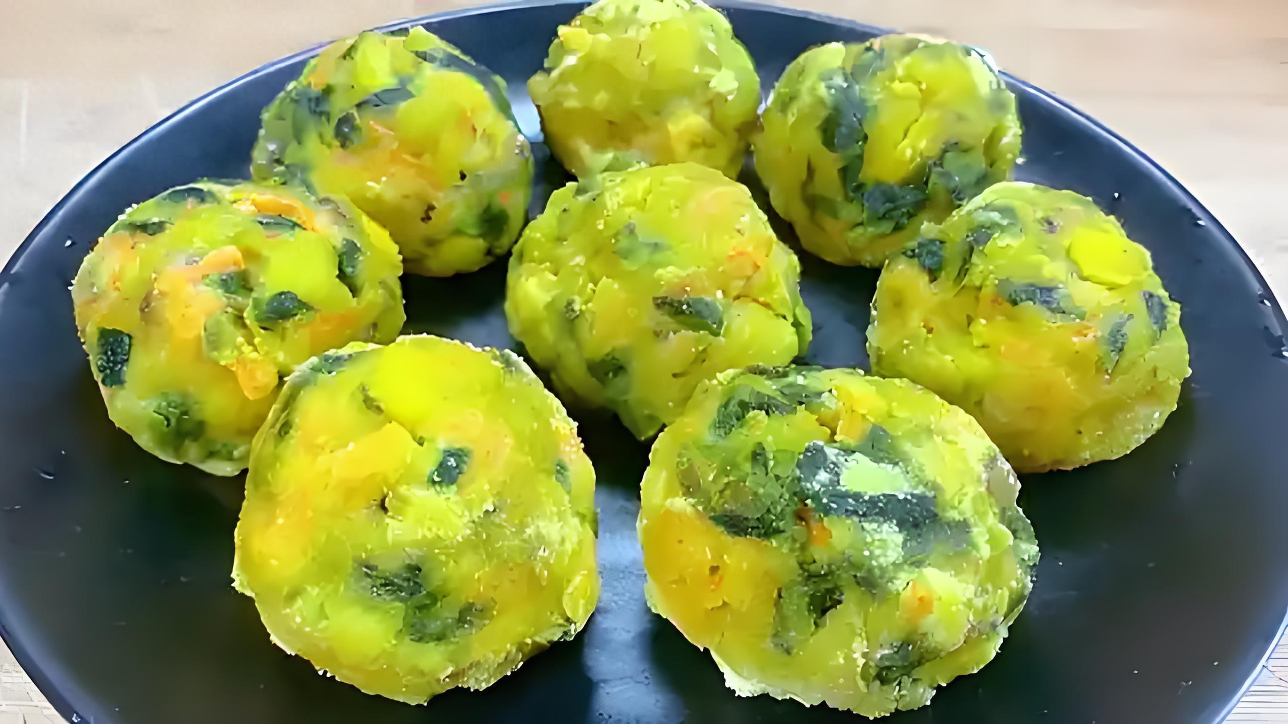 5、把菜球放進幹玉米麪裏滾幾圈,均勻裹上一層“黃金甲”,用手再輕輕攥實,讓玉米麪粘牢。