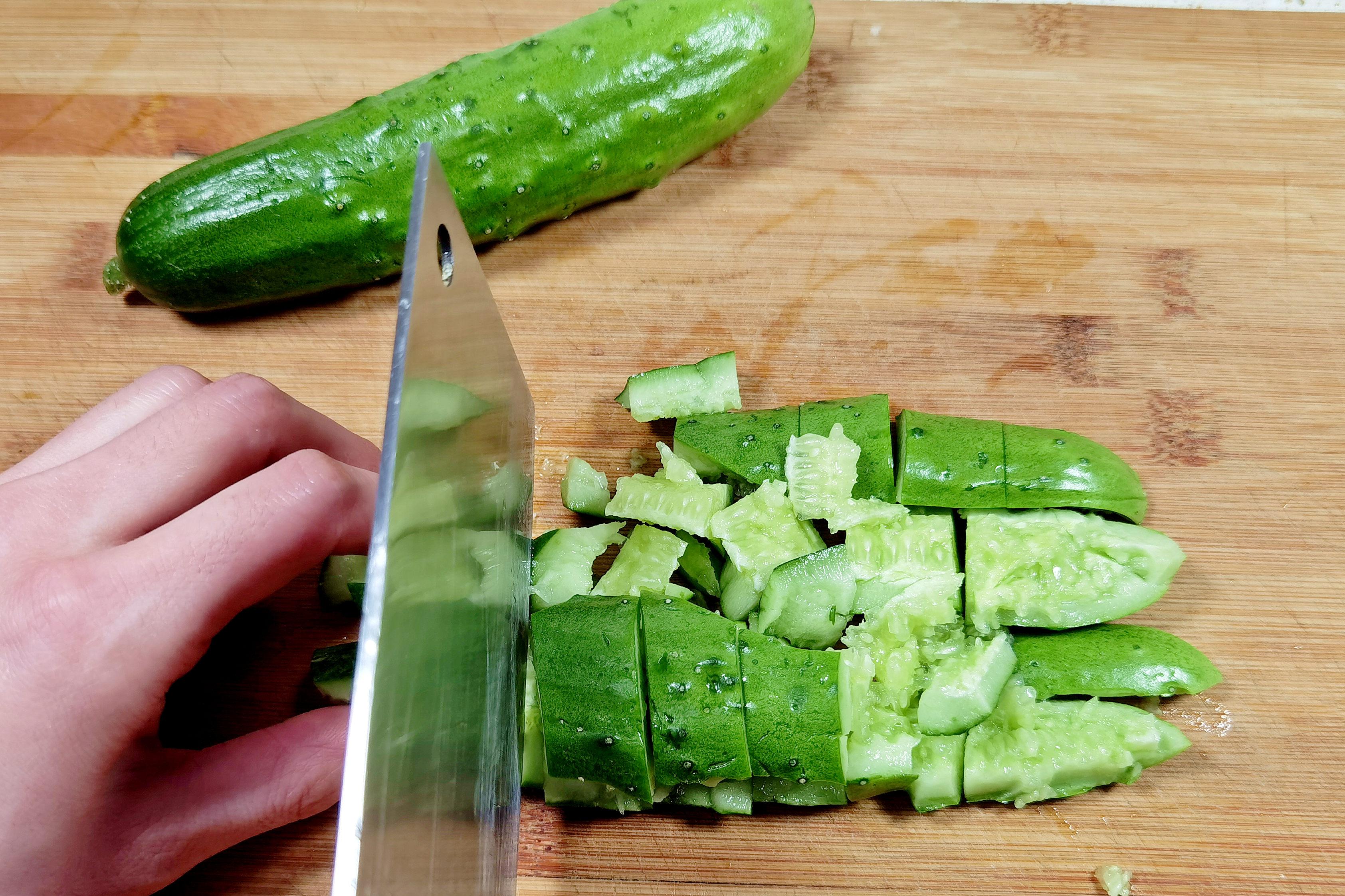 1、頂花帶刺的嫩黃瓜兩條(約500克),清水洗淨。無需削皮,保留那抹鮮綠纔夠夏天!放案板上,用菜刀平拍至裂開(拍比切更易入味),再斜切成適口滾刀塊。別小看這“一拍”,裂開的紋理纔是滋味鑽進去的祕道。