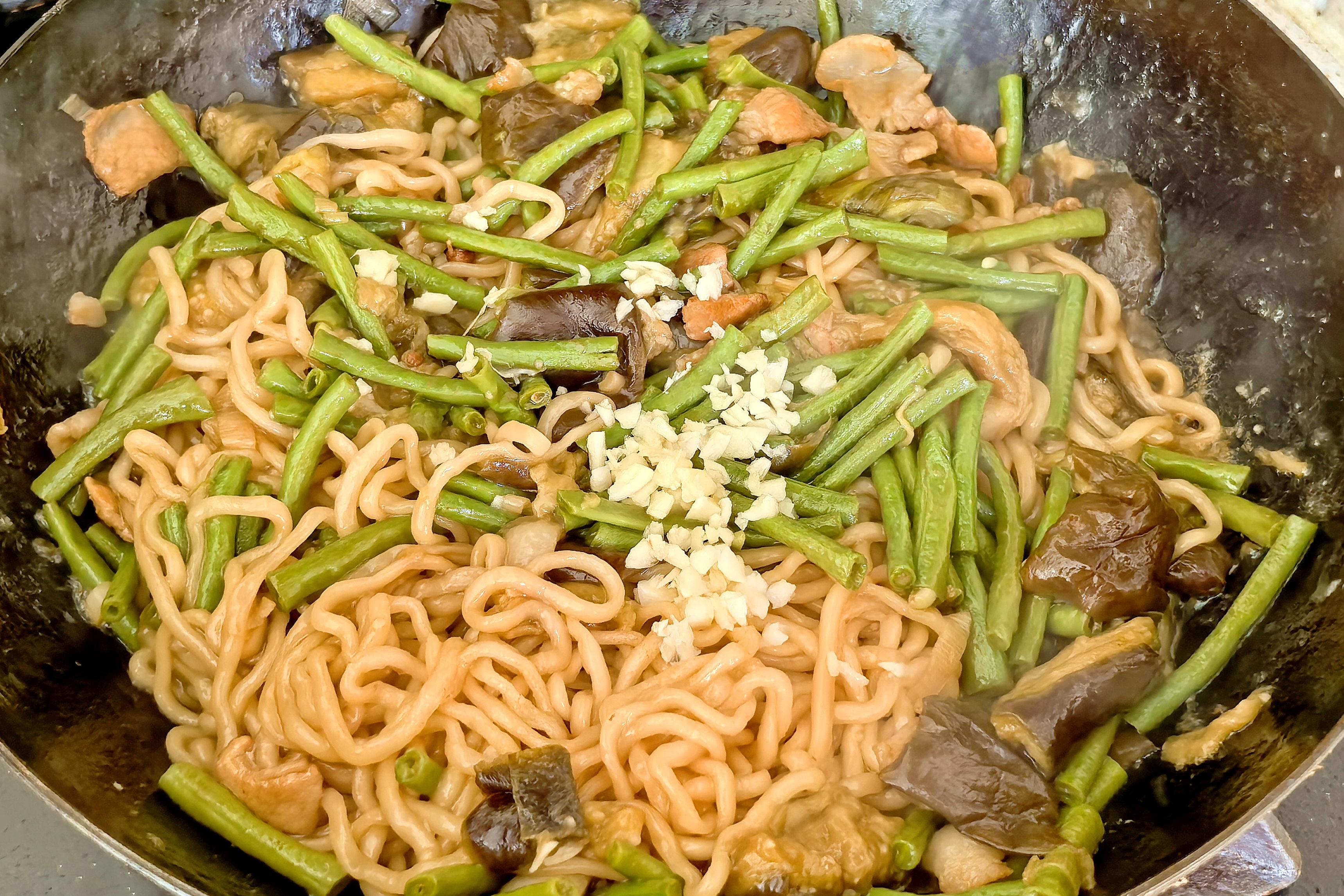 4. 靜靜等待大約十分鐘。此時廚房裏瀰漫的香氣簡直是對意志力的終極考驗!當聽到鍋底傳來細微而歡快的“滋滋”聲,湯汁明顯收濃變少,便是揭曉時刻。掀開鍋蓋,撒入預留的生蒜末,再淋上幾滴香油或花椒油——香氣剎那衝頂!用筷子快速而溫柔地將麪條與鍋底的豆角、茄子翻拌均勻,讓每一根麪條都貪婪地吸飽鹹鮮濃香的湯汁。