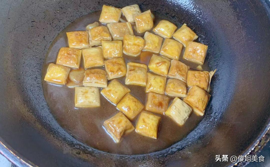 4、豆腐兩面都煎出淡淡金黃脆皮時,淋入生抽,繞着鍋邊畫圈澆下!撒鹽,喜歡甜鮮口就加一指甲蓋糖。繼續保持小火! 用筷子輕輕撥動豆腐,讓每塊都裹上醬汁,像給豆腐穿上一層琥珀色琉璃衣。關火! 撒入翠綠蔥花,餘溫瞬間激發出蔥香。講究人再撒把白芝麻,香氣層次直接拉滿!