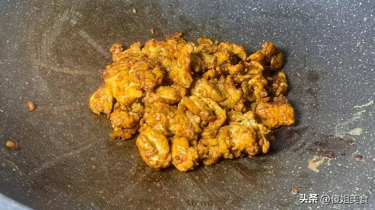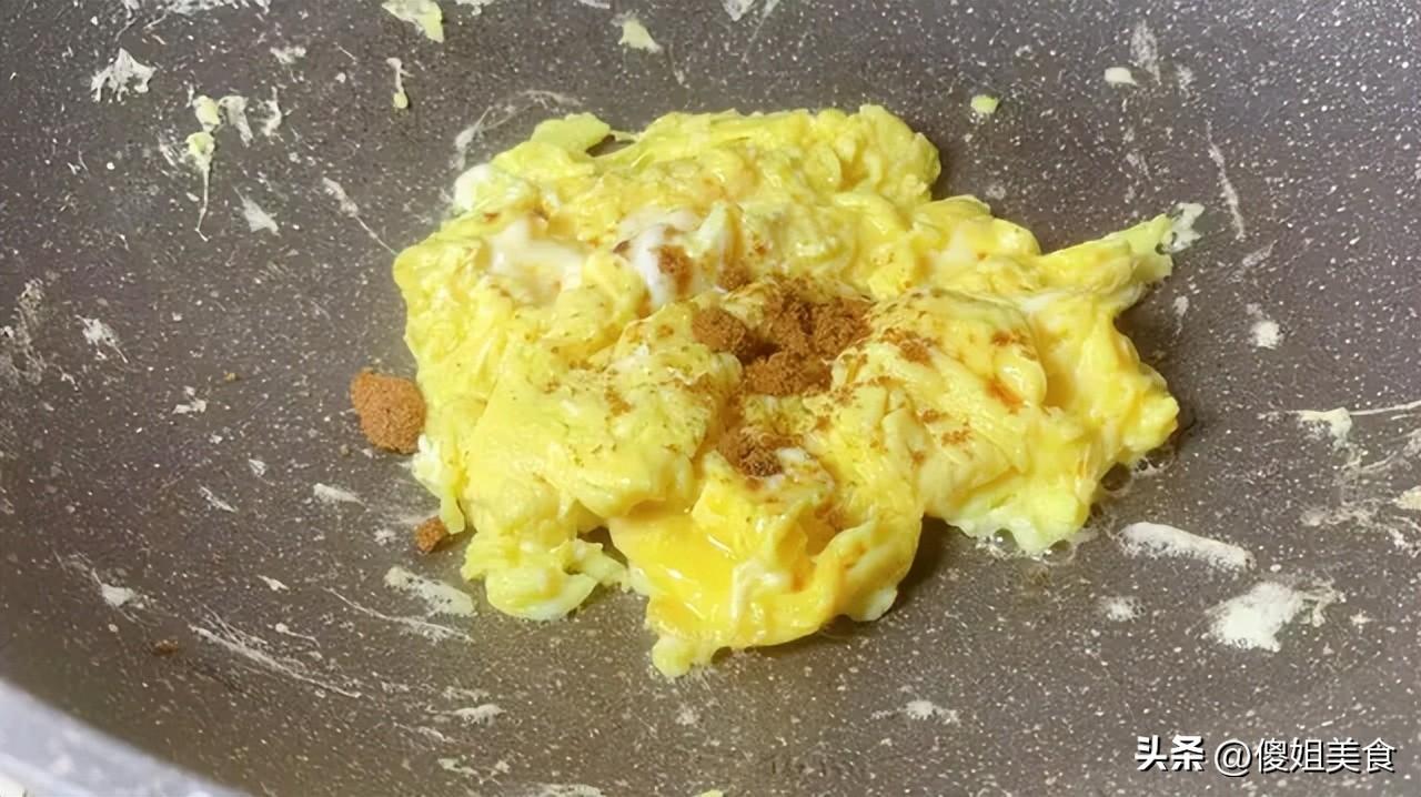 5、關鍵一步! 看到鍋裏的雞蛋基本都凝固了,變成嫩黃誘人的小塊塊了?這時候把紅糖撒在雞蛋塊上!緊接着,把小半勺鹽也撒上去。鹽能很好地平衡紅糖的甜,讓味道更有層次,不齁甜。快速翻炒! 讓紅糖和鹽在熱氣的作用下,趕緊裹到每一塊雞蛋上。你會看到紅糖微微融化,給雞蛋染上一點焦糖色,香氣“噌”地就上來了!再快速翻炒個十幾秒,關火!