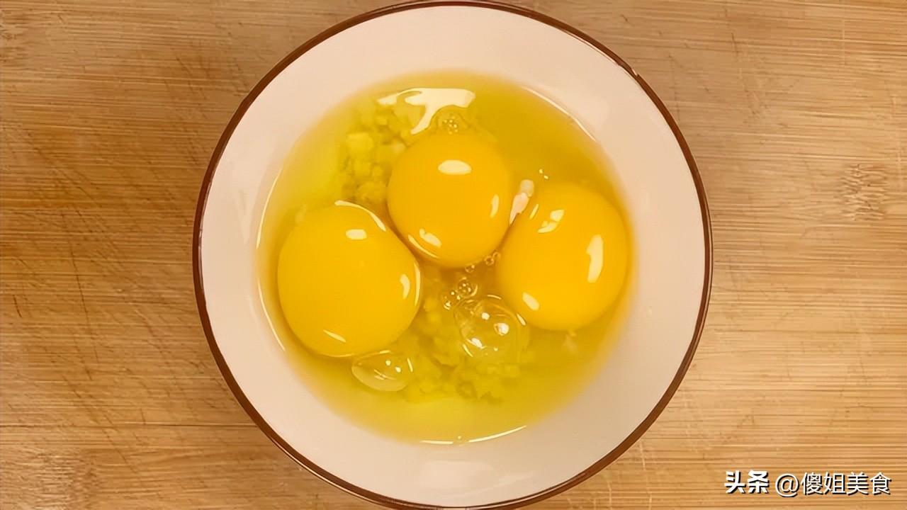 2、拿個大碗,把切好的薑末一股腦倒進去。雞蛋哐哐哐敲進去。拿起筷子或打蛋器,嘩啦嘩啦使勁攪! 把雞蛋徹底打散,讓金黃的蛋液和嫩黃的薑末充分擁抱在一起。攪勻了就放着,讓它們先“熟悉熟悉”。
