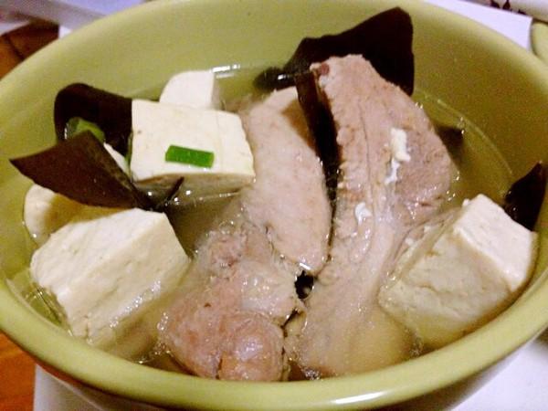 食材;海帶1片,豬骨2塊,豆腐1塊,鹽, 胡椒粉,蔥,姜