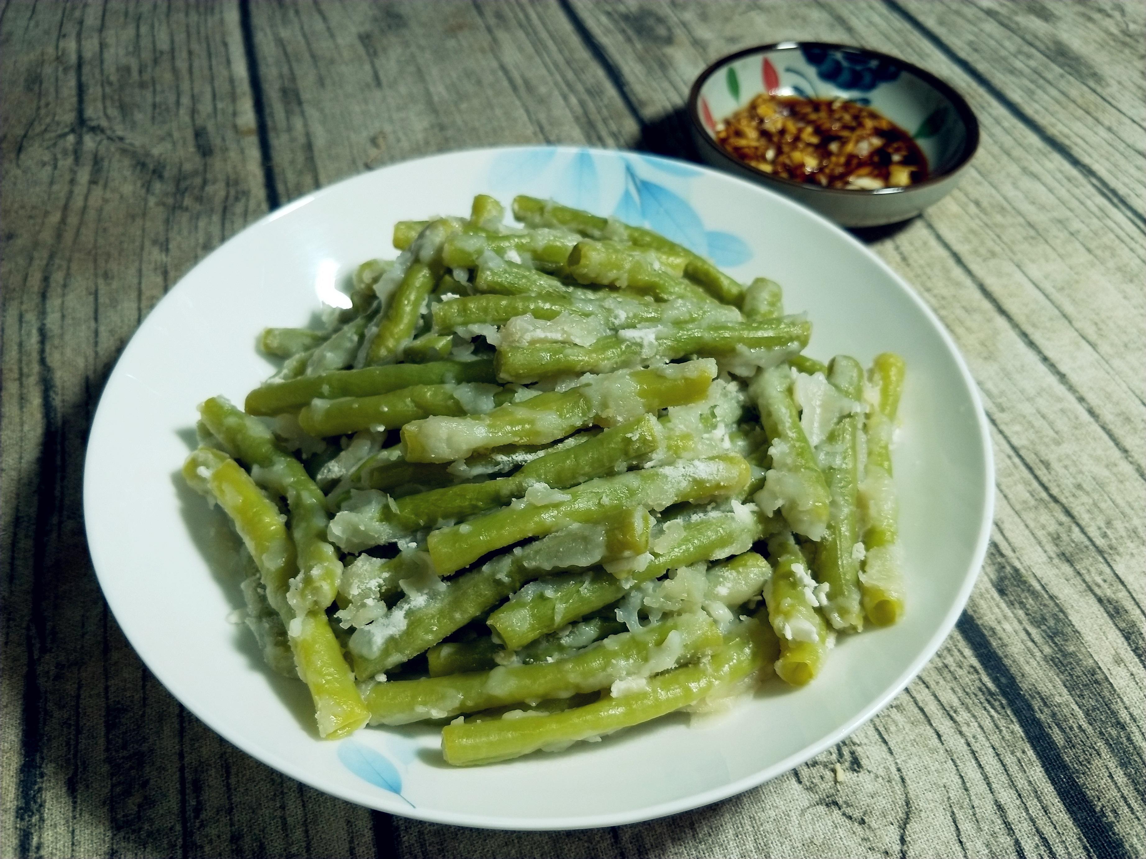 食材:豇豆1把,麪粉,鹽, 生抽,大蒜
