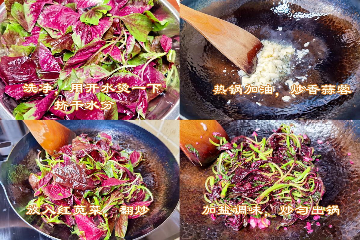 食材:紅莧菜一大把、蒜瓣5-6粒、鹽適量、少許糖提鮮、食用油。