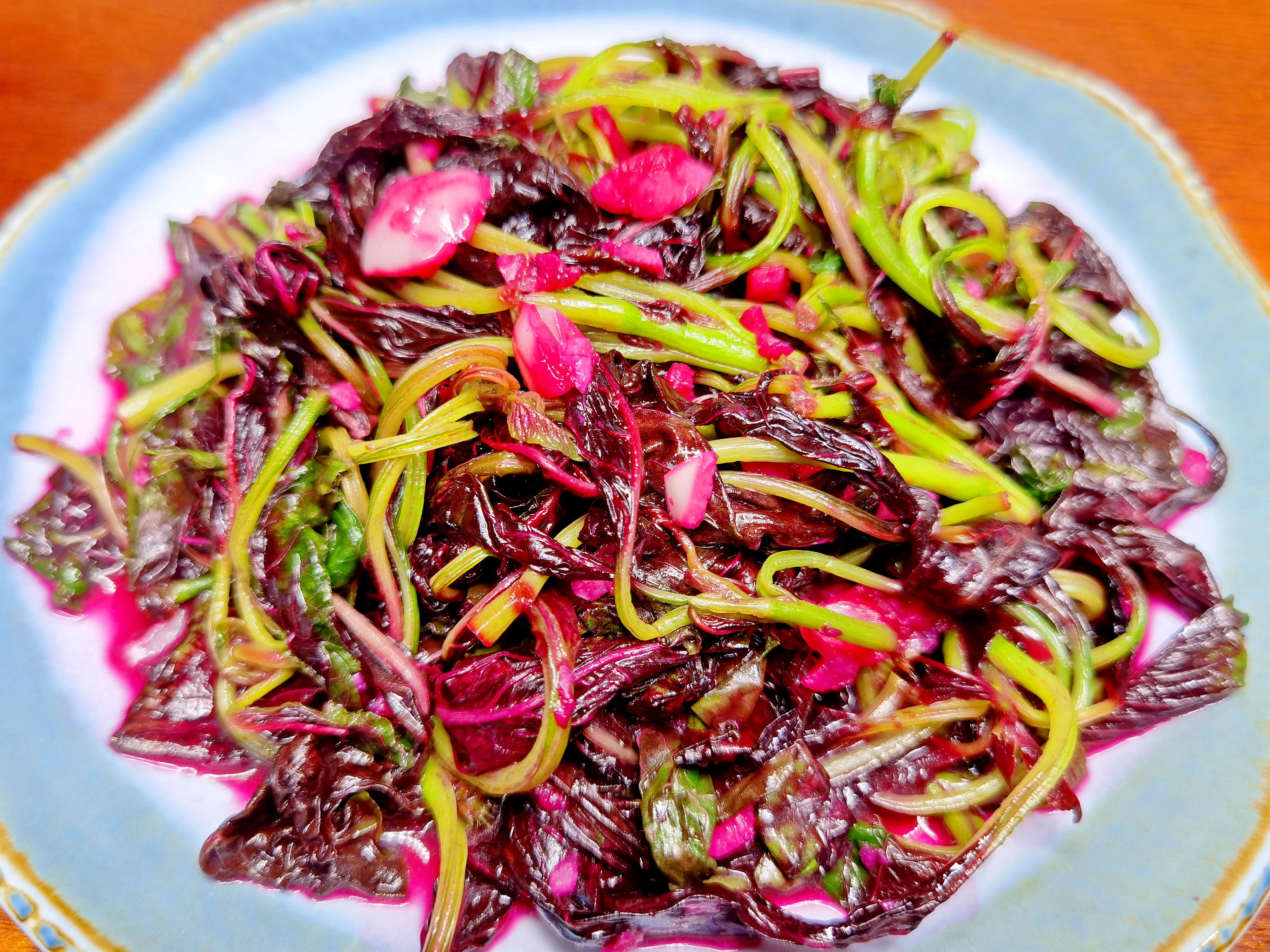 揭蓋瞬間,熱霧裹挾着濃烈的蒜香與莧菜特有的清氣撲面而來。盤中莧菜葉片柔順油亮,浸潤在醇厚的紫色湯汁裏,宛如紫玉溶成的瓊漿。夾一筷入口,嫩滑得幾乎不用咀嚼,草澀味無蹤無影,唯有純淨的清甜混合着熟蒜的焦香與生蒜的鮮辣,在舌尖層層遞進。若盛一碗白飯,舀兩勺那濃稠的紫湯澆上,白飯頃刻染作夢幻的霞色,鹹鮮中帶着回甘,是樸素飯菜裏最奢侈的享受。