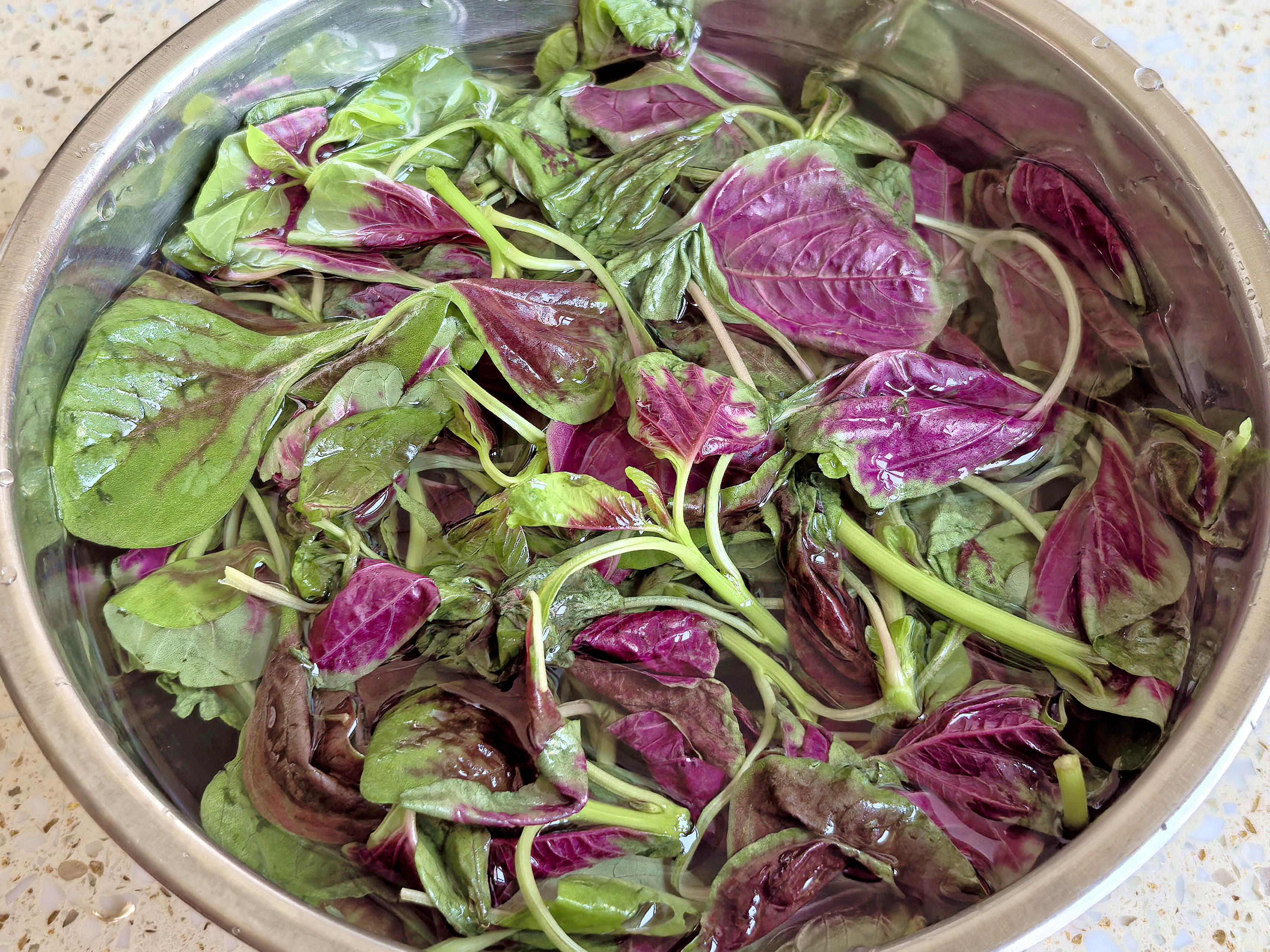 1.仔細揀去莧菜的老梗與黃葉,清水溫柔沖洗幾遍,尤其葉柄縫隙處的泥沙要特別留意。瀝乾水分後,將整把莧菜鬆鬆放入大盆中。