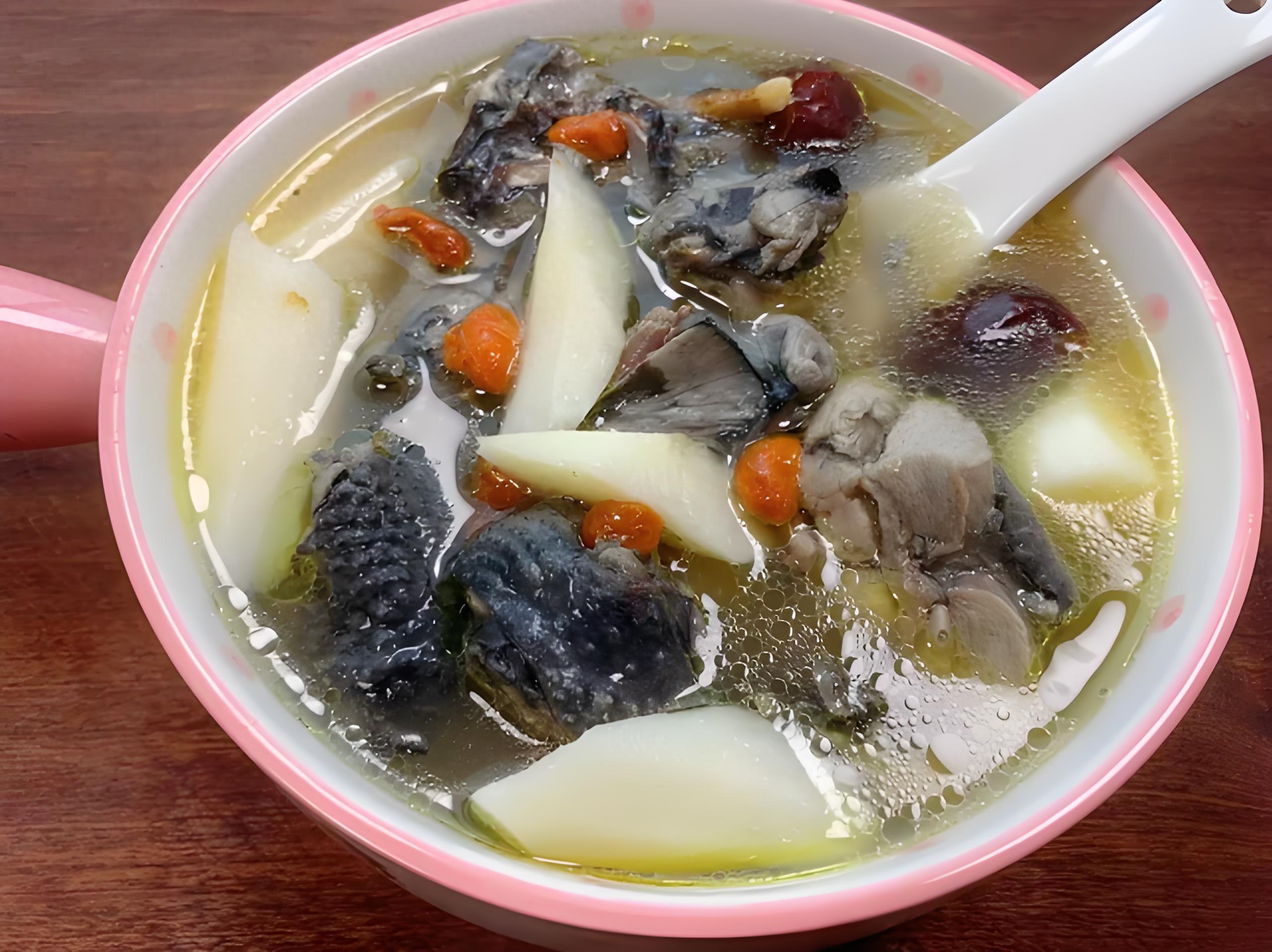 3、1小時後,加入山藥塊和紅棗,繼續蓋上蓋子小火燉煮30-40分鐘,直到山藥軟糯。 最後5分鐘,撒入枸杞。關火後,根據口味加一點點鹽調味即可(補氣血的湯,鹽一定少放,別壓住了食材本身的甘甜)。