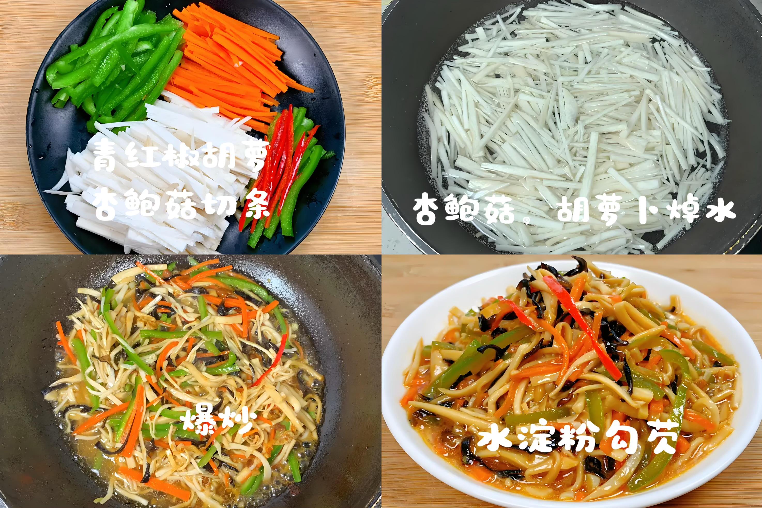 2、鍋裏油燒熱,先下胡蘿蔔片略炒,接着倒入杏鮑菇片翻炒至變軟、邊緣微焦。