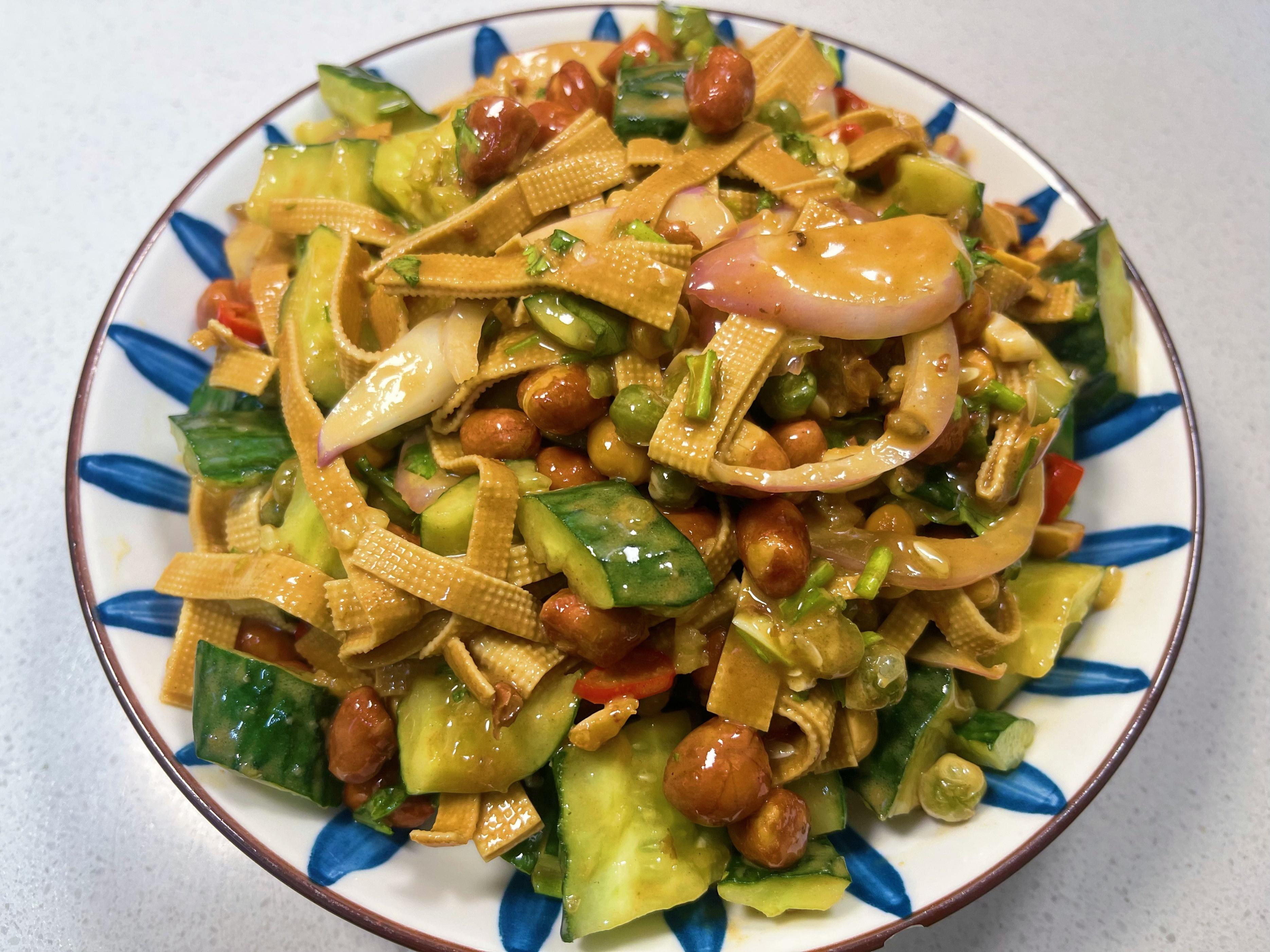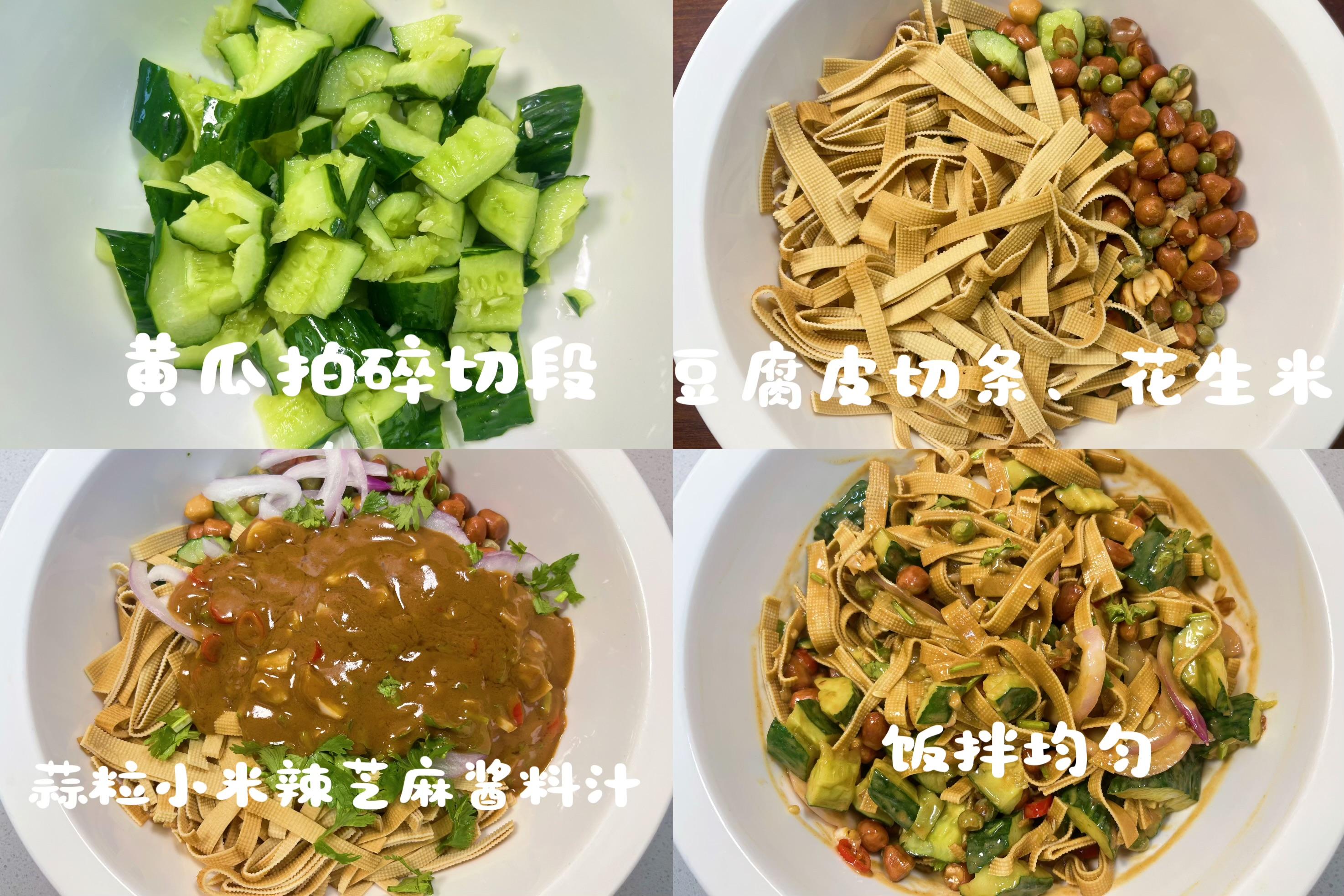 黃瓜拍過更入味,脆生生自帶清涼感;豆腐皮(千張)富含優質蛋白和鉀;花生米和芝麻醬提供香氣和滿足感。這一碗拌菜,酸香開胃,口感豐富,專治各種天熱沒食慾!當涼菜、配粥、下酒,絕了!