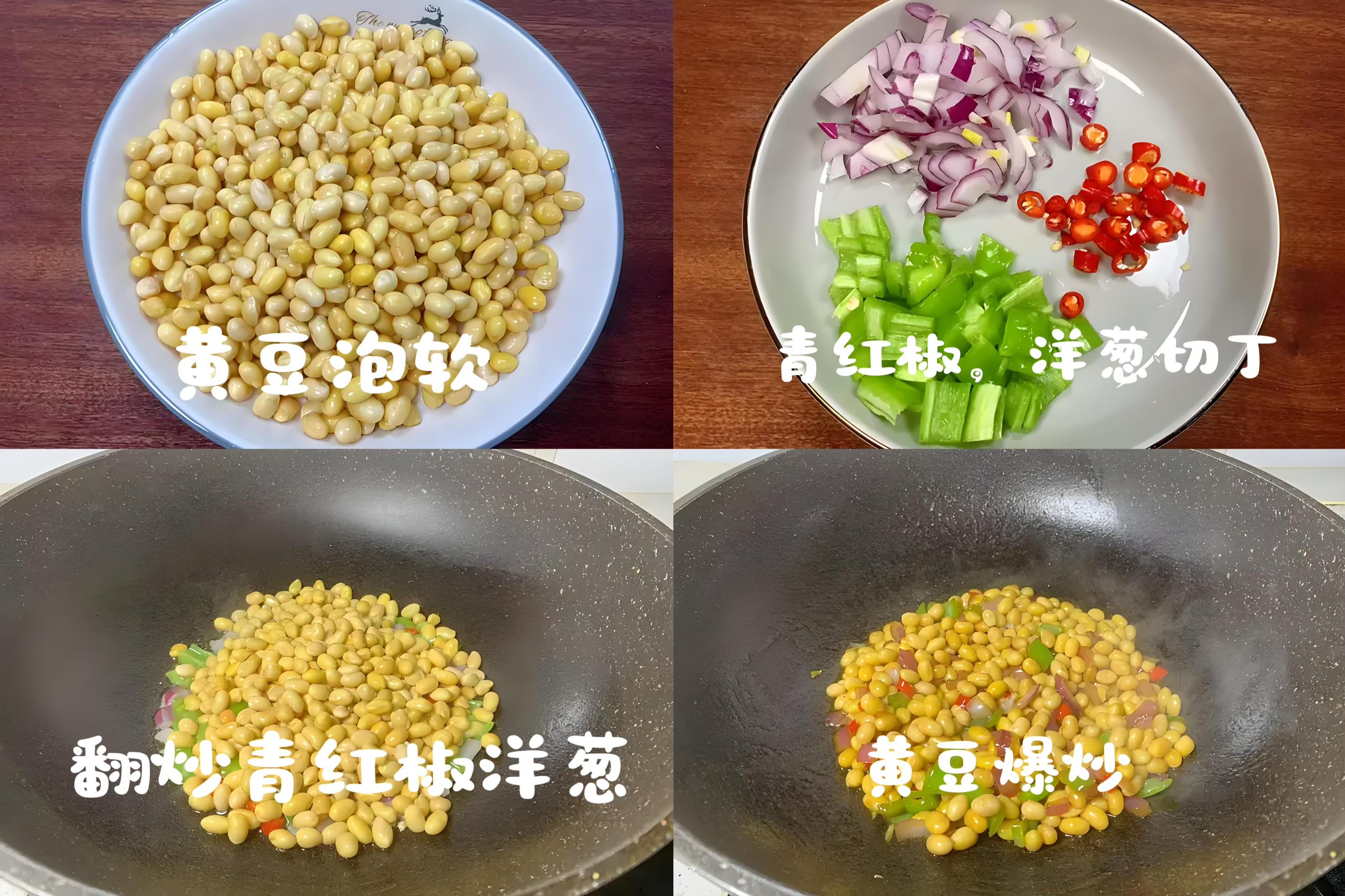1、煮熟的黃豆瀝乾水分(買現成熟黃豆更省事)。洋蔥、青紅椒切丁。