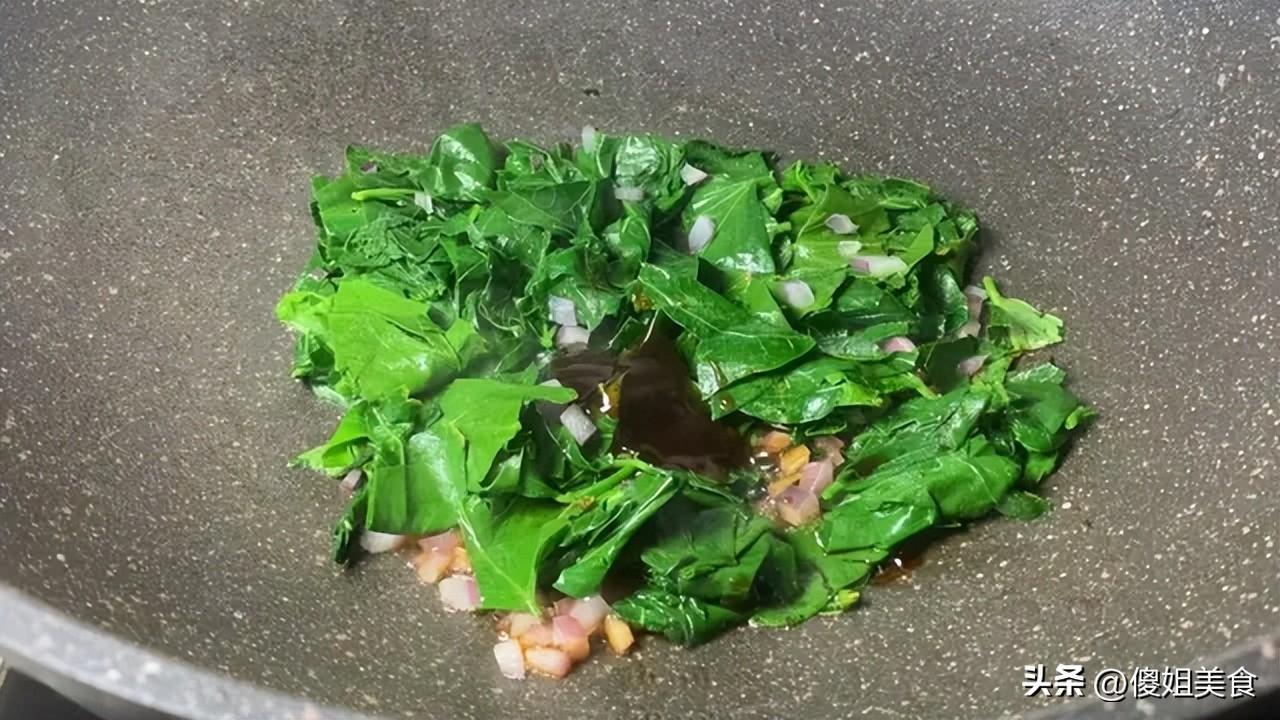 小料的香味一出來,立刻轉大火!把攥幹切好的豆角葉"嘩啦"一下全倒進鍋裏。別猶豫,快速翻炒!讓每一片葉子都裹上熱油,瞬間激發香氣。翻炒大約1分鐘左右,看到葉子完全受熱、油潤髮亮了,就開始調味:撒入小半勺鹽(先少放,嚐了不夠再加),沿着鍋邊淋入1勺醬油,那股醬香味"滋啦"一聲就竄上來了!接着再淋入半勺味極鮮(或蠔油),繼續快速翻炒均勻。整個過程要快!大火快炒是保持蔬菜鮮嫩和鍋氣的祕訣。看到所有葉子都均勻裹上醬色,香味撲鼻,立刻關火出鍋!千萬別炒老了!