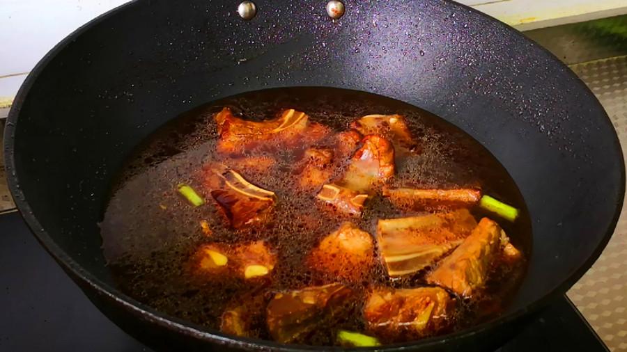 3、鍋加放少許油,再加入幾塊冰糖,小火炒至冰糖融化,繼續炒至糖變成深褐色,冒小泡時,迅速將瀝乾水分的排骨倒入,快速翻炒,讓每塊排骨都均勻地裹上糖色,一定要注意火候,別給炒糊了,會發苦!