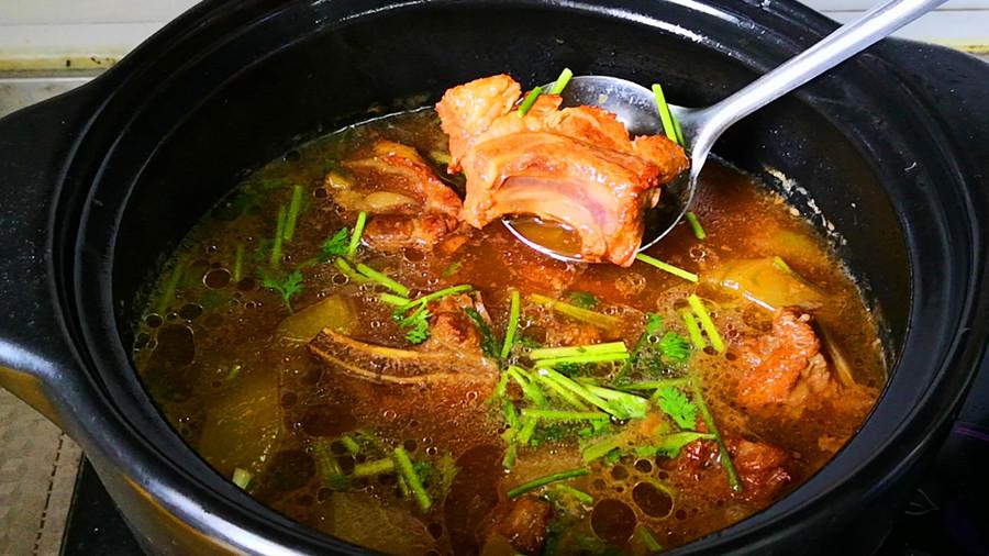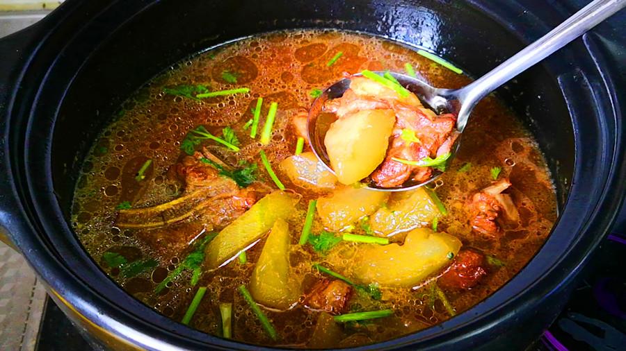 4.大約燉一個小時後開鍋,將冬瓜塊放入,繼續燉上10~15分鐘左右,將冬瓜塊燉至透明就可以了,出鍋前撒點鹽,少加點胡椒粉,再加一把香菜段,美味即成!