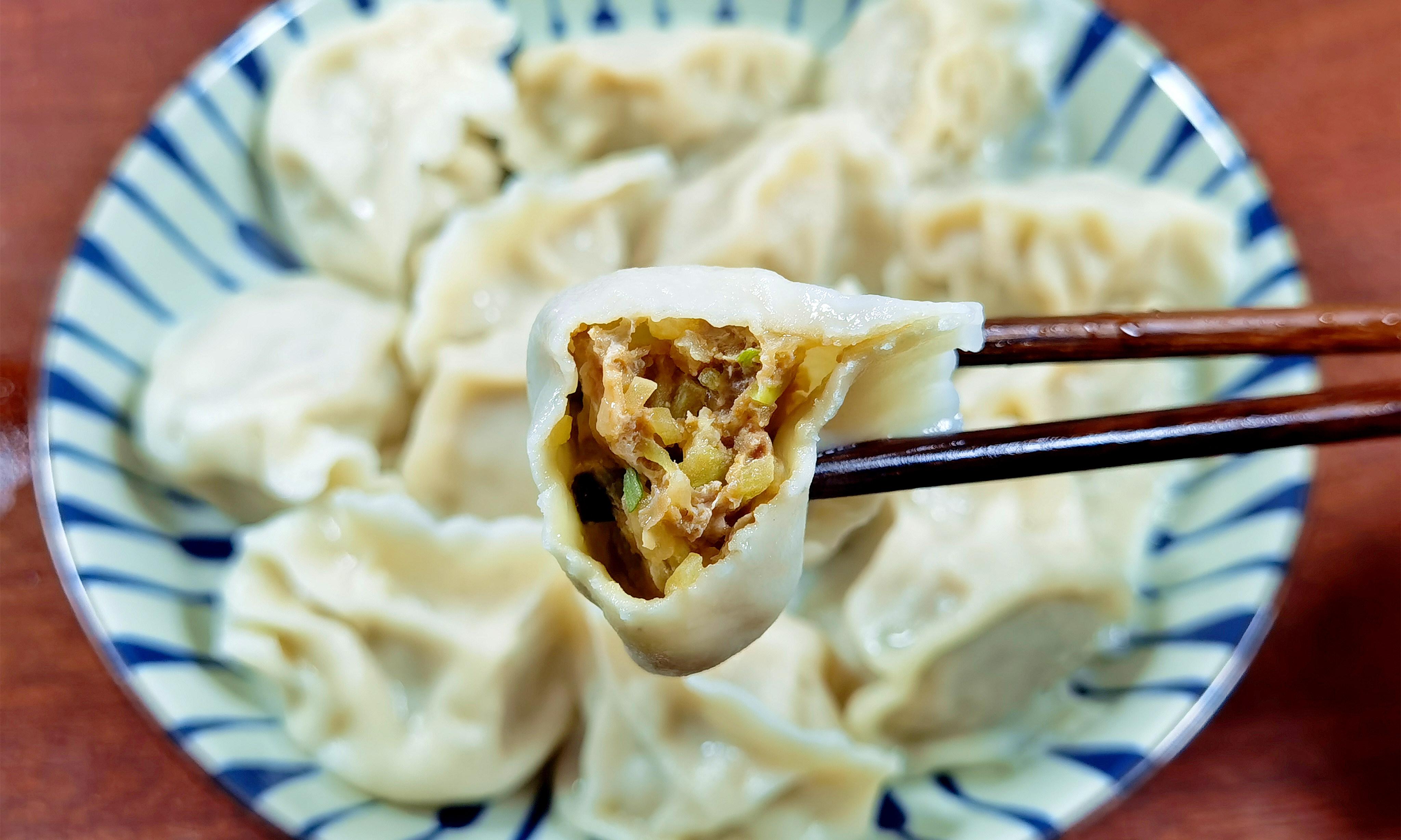 4、包好餃子,開水下鍋煮熟,點兩次涼水,待餃子圓鼓鼓浮起即可撈出。